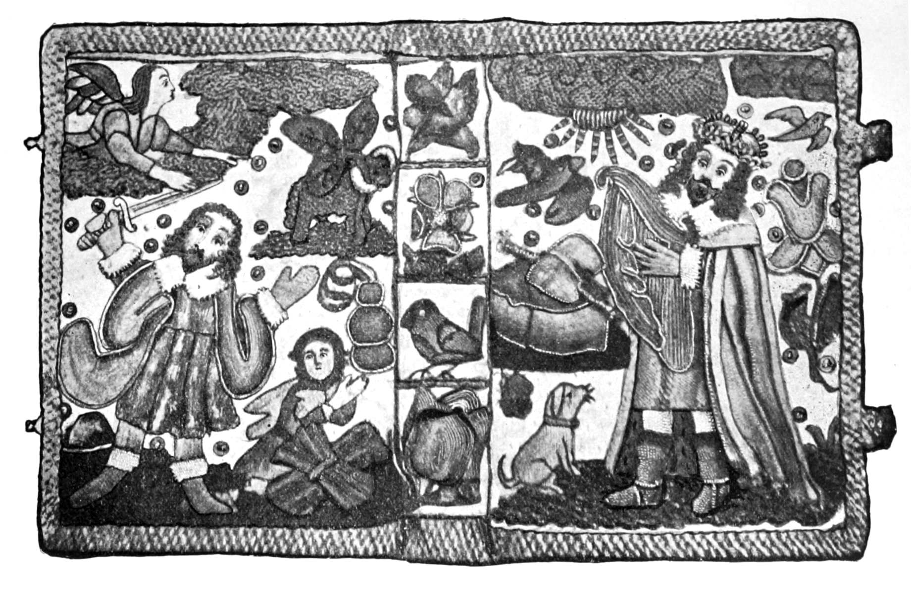 It is a New Testament, printed in London in 1625, and covered in white satin, with a different design embroidered on each side. It measures 4½ by 3½ inches. On the upper board is David with a harp. He wears a long red cloak lined with 87ermine, with a white collar, an under-garment of pale brown, and high boots with spur-straps and red tops. On his head is a royal crown of gold with red cap, and he is playing upon a golden harp. The face of this figure resembles that of Charles i. The red cloak is worked in needlepoint lace, and is in deep folds in high relief. These folds are actually modelled in waxed paper, the needlework being stretched over them, and probably fixed on by a gentle heat. The other parts of the dress are worked in the same way, but without the waxed paper, and the edges of the garments are in some places marked with what might be called a metal fringe, made in a small recurring pattern.