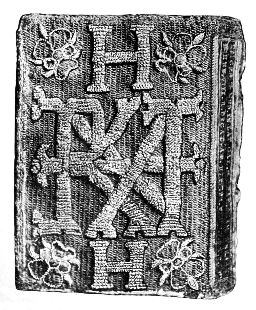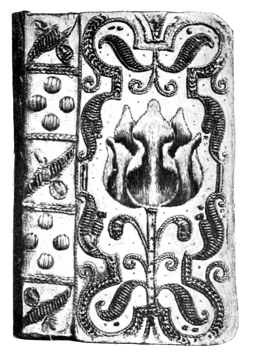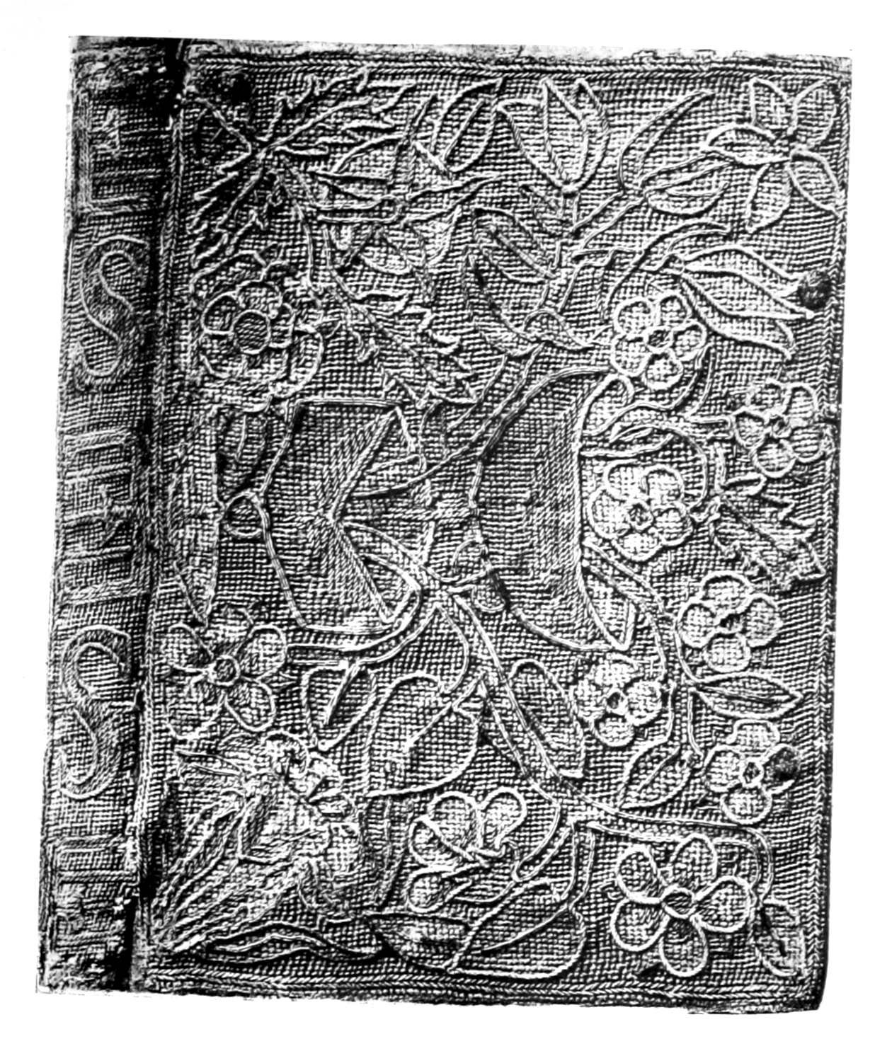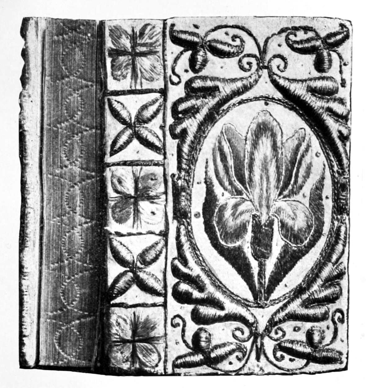 In the History of the Worthies of England, by Thomas Fuller, there is a short note about Little Gidding, and he says about the ladies there that 'their own needles were emploied in learned and pious work to binde Bibles.' This note and the mention of needles may have perhaps given the start to the belief that embroidered work was intended, but in all probability it only refers to the sewing of the leaves of the books upon the bands of the back, which is done with needle and thread. Moreover, the ladies of Little Gidding104 did actually sew the backs of their books in a needlessly elaborate way, putting in ten or twelve bands where three or four would have been ample. I also think that if embroidery had been intended by the sentence above quoted, it would have been more clearly mentioned. To 'emploie needles to bind Bibles' is hardly the description one would expect if the meaning was that when bound the Bibles were covered in embroidered work; but it may be safely interpreted as it is written, the sewing being a most important part of a bookbinding, and one likely to be much thought of by amateur binders, as the nieces of Nicholas Ferrar were.