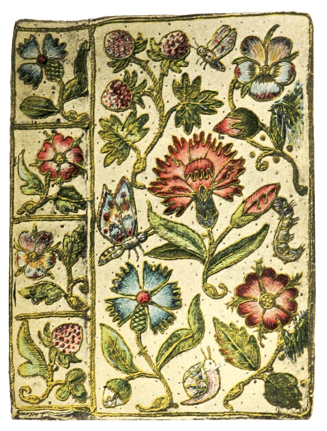 Henshaw's Horæ Successivæ, printed in London in 1632, is bound in white satin, and measures 4½ by 2 inches. It is very delicately and prettily worked in a floral design, the same on both sides, and is remarkable for its simplicity—a flower with stalk and leaves in the centre, one in each corner, and an insect in the spaces between them. The centre flower is a carnation, round it are pansy, rose, cornflower, and strawberry, while between them are a caterpillar, snail, butterfly, and moth. All of these are delicately worked in feather-stitch in the proper colours, and edged 91all round with fine gold cord; the stalks are of the same cord used double. On the strawberries there is some fine knotted work.