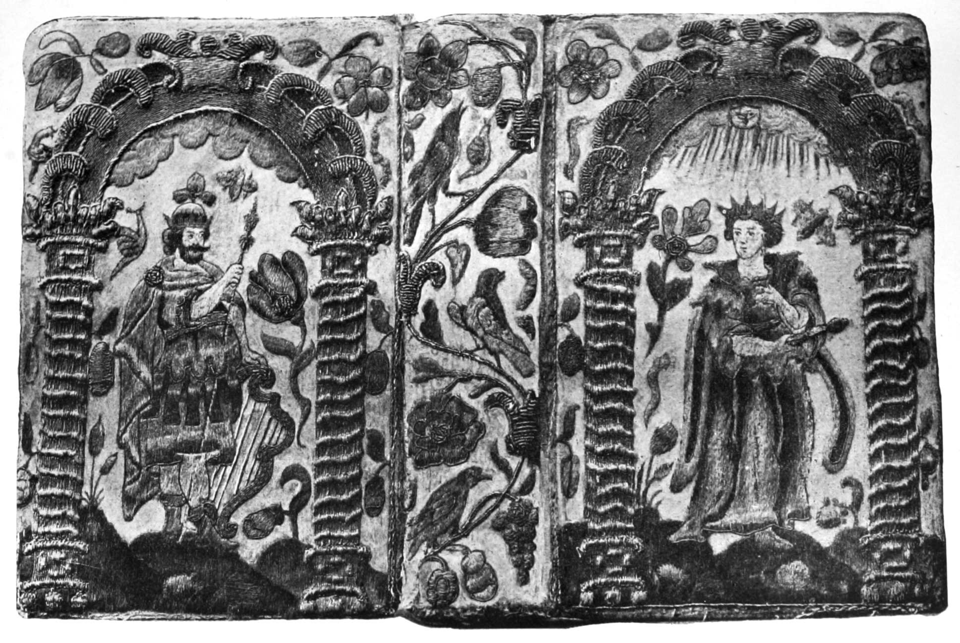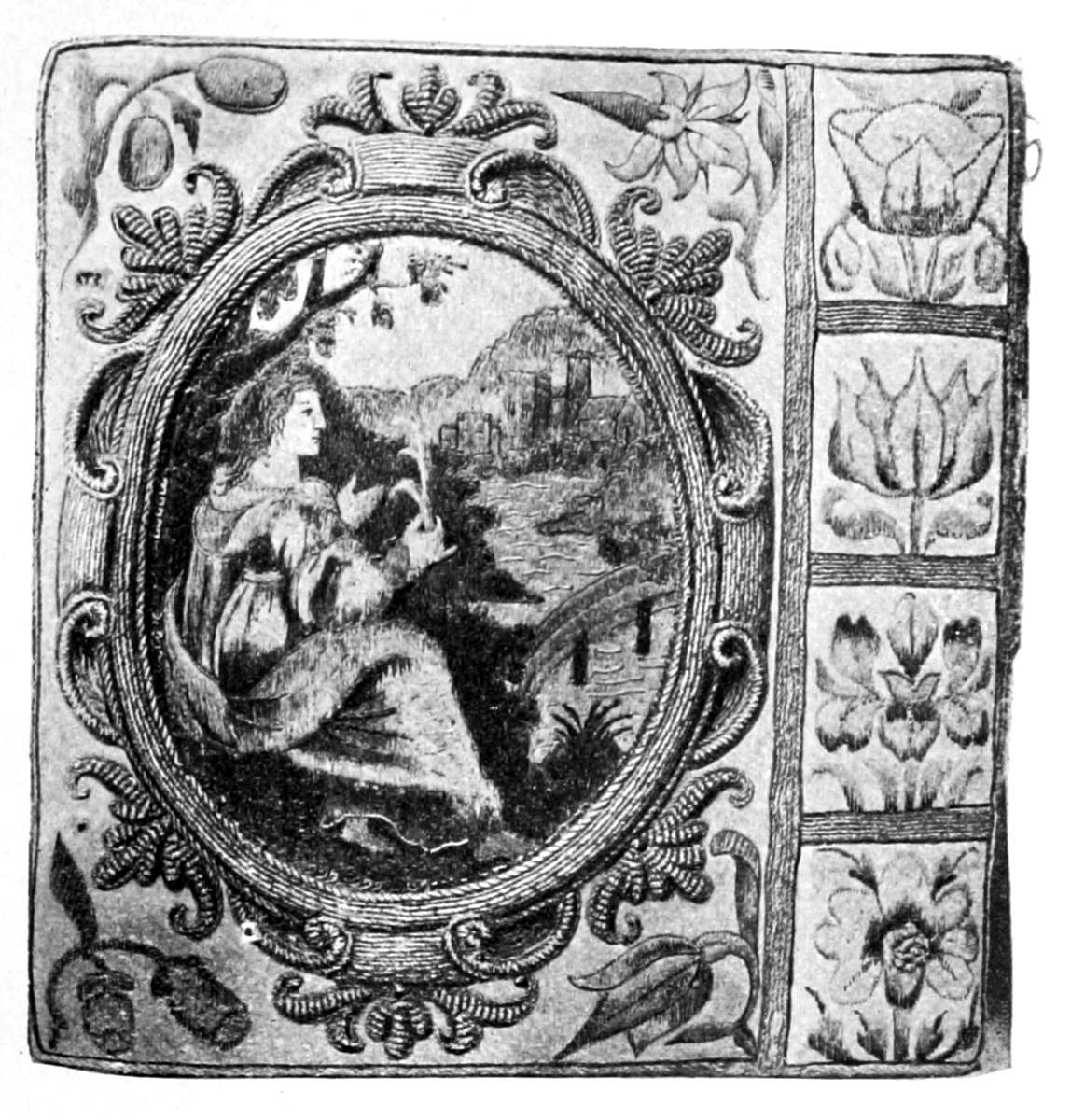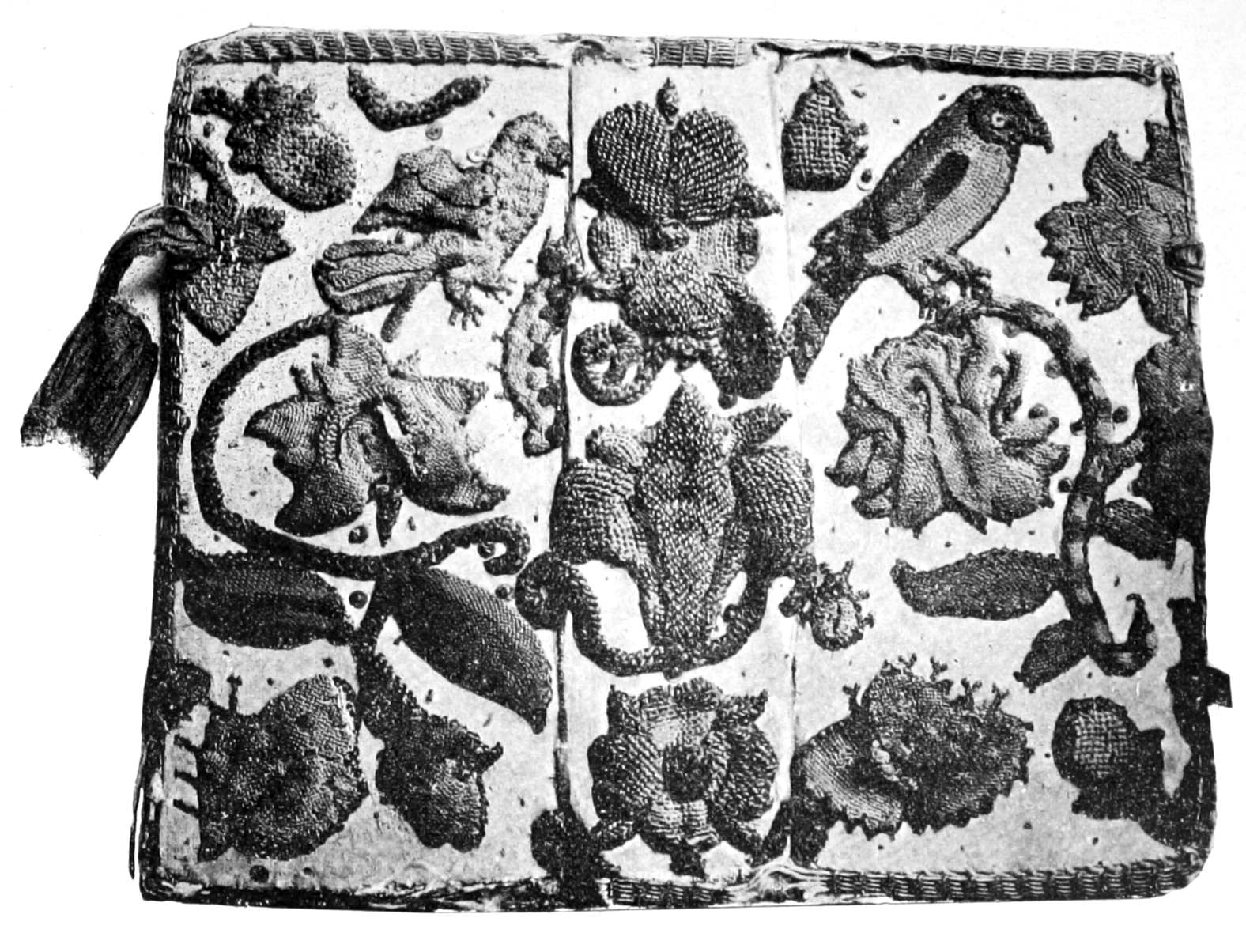 A copy of The Way to True Happiness. printed in London in 1639, is bound in white satin, and embroidered with figures of David and a Queen. It is a little larger than the majority of the satin-embroidered books, measuring 7 by 4½ inches, and is, for its time, a very fine specimen. Both figures stand under an archway with columns, all worked heavily in silver cord, guimp, and thread. The columns have ornamental capitals and a spiral running round their shafts, and the upper edge of the arch is ornamented with crockets of a peculiar shape. Within this archway, on the upper cover, is a full-length figure of a Queen, finely worked in split-stitch with coloured silks. She wears a red dress with long, falling sleeves, a purple body and gold collar. On her head is a golden crown, with six points. She carries, in her left hand, a golden sceptre, and has also a golden belt. The outlines are everywhere marked either with a gold or silver twist. On the ground, which is in small hillocks, grow a strawberry and two other small plants; a snail is also shown. Scattered about the field are a 'skeleton' caterpillar—at one time probably filled in with peacocks' feathers,—a conventional lily, a butterfly, and the sun, with rays, just appearing from under a cloud. In the two upper 100 corners are flowers, a pansy and another, and smaller ones down each side.
