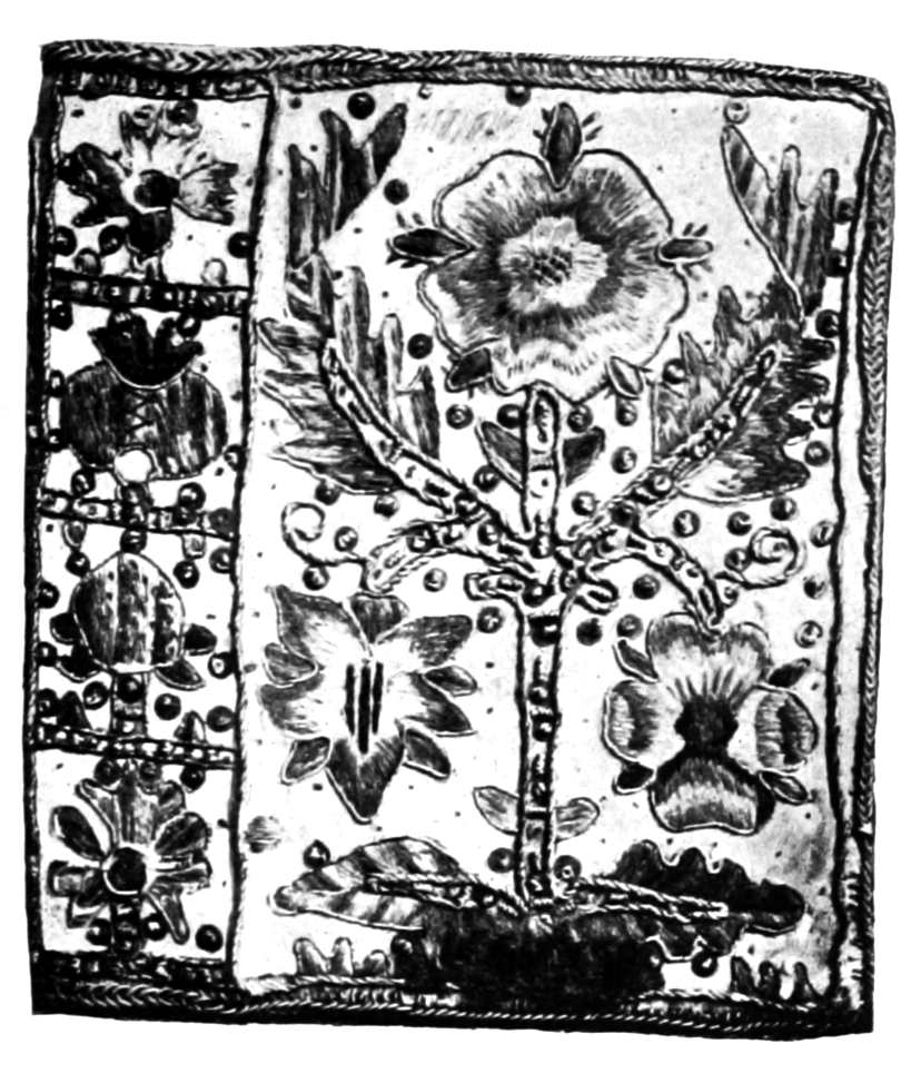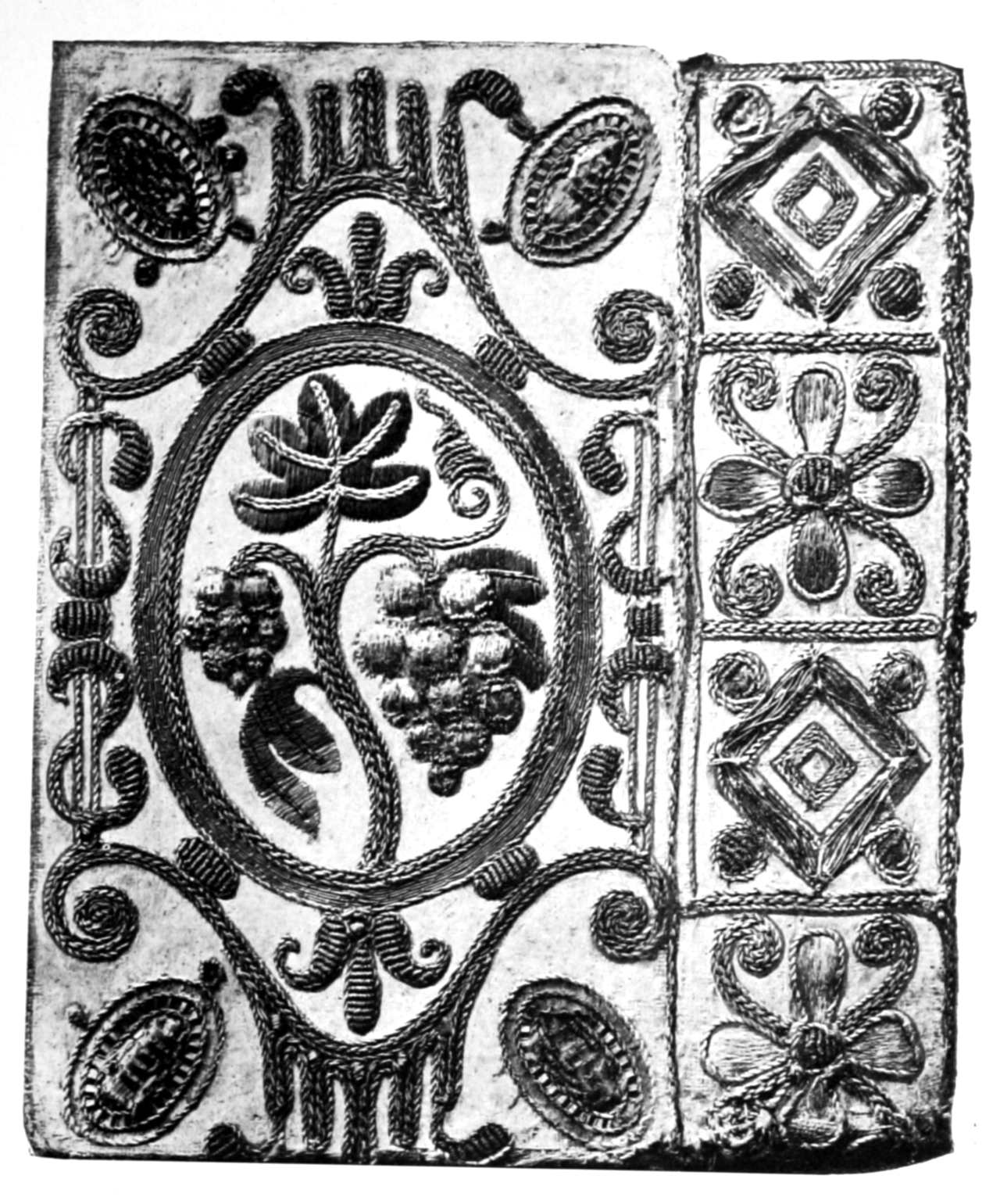 A Bible printed in London in 1646 is bound in white satin, and embroidered in coloured silks and gold braid and cord, measuring 6 by 3½ inches. The same design is on both sides. In the centre within an oval of gold braid and cord is a spray of vine, with two bunches of grapes, three leaves and a tendril, the fruit and leaves worked in silk, and the 110 stem in gold cord. Enclosing the oval is an arabesque design worked in gold cord and guimp, and at each corner is an oval of thin gold strips and gold cord; the gold strips are done in the manner known as 'lizzarding,' and are kept down by small stitches at intervals.