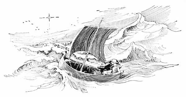 On, on, many days on sailed Norss—so many leagues that he thought he must have compassed the earth. In all this time he knew no hunger nor thirst; it was as the spirit had told him in his dream—no cares nor dangers beset him. By day the dolphins and the other creatures of the sea gambolled about[7] his boat; by night a beauteous Star seemed to direct his course; and when he slept and dreamed, he saw ever the spirit clad in white, and holding forth to him the symbol in the similitude of a cross.