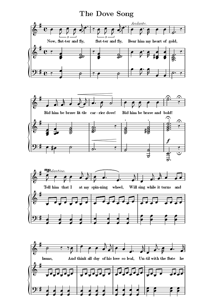 Scene I. In the Tower Room. Princess Winsome and Hero. Godmother brings spinning-wheel on which [pg 4] Princess is to spin Love's golden thread that shall rescue her brother. Dove comes with letter from Knight. Flower messengers in turn report his progress. Counting the Daisy's petals the Princess learns that her true Knight has found the flute.
