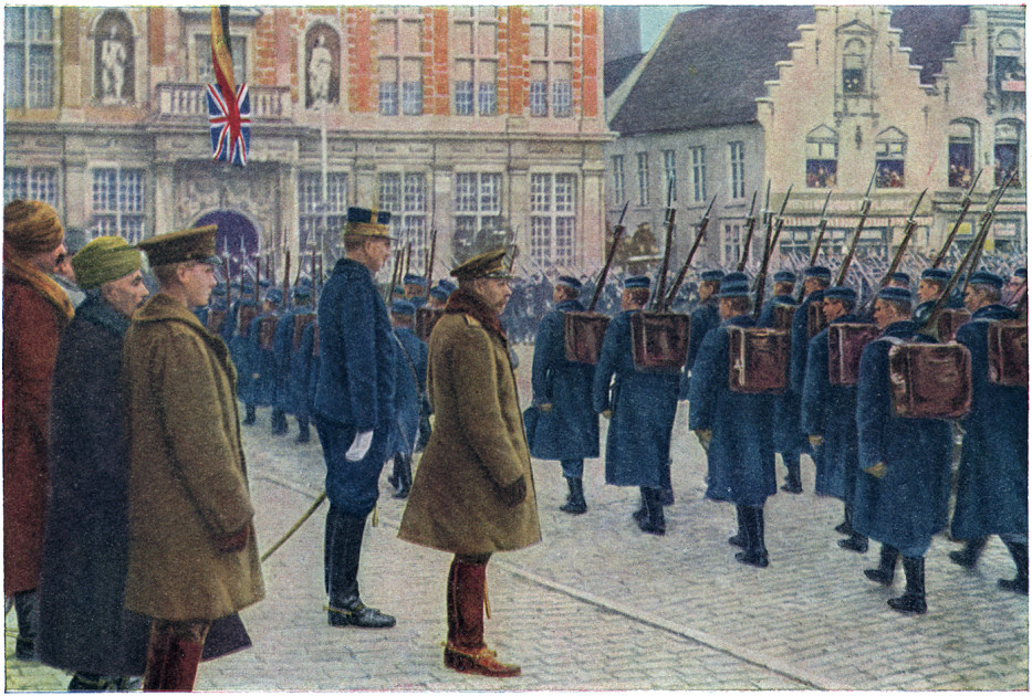 | King George V of Britain and King Albert of Belgium inspecting Belgian troops. The youth is the Prince of Wales, and beside him is Major General Pertab Singh of the Indian army |