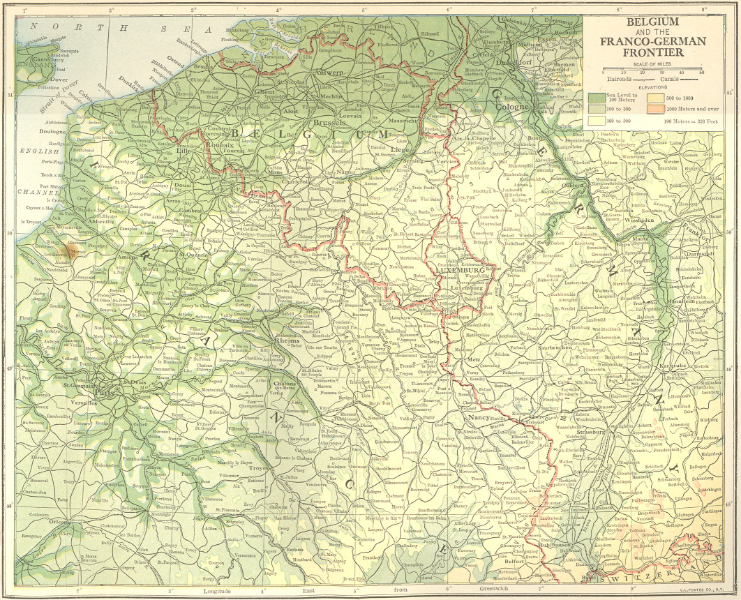 A view of Liege will assist in revealing its three days' siege, with the resulting effect upon the western theatre of war. Liege is the capital of the Walloons, a sturdy race that in times past has at many a crisis proved unyielding determination and courage. At the outbreak of war it was the center of great coal mining and industrial activity. In the commercial world it is known everywhere for the manufacture of firearms. The smoke from hundreds of factories spreads over the city, often hanging in dense clouds. It might aptly be termed the Pittsburg of Belgium. The city lies in a deep, broad cut of the River Meuse, at its junction with the combined channels of the Ourthe and Vesdre. It stretches across both sides, being connected by numerous bridges, while parallel lines of railway follow the course of the main stream. The trunk line from Germany into Belgium crosses the Meuse at Liege. For the most part the old city of lofty houses clings to a cliffside on the left bank, crowned by an ancient citadel of no modern defensive value. Whatever picturesqueness Liege may have possessed is effaced by the squalid and dilapidated condition of its poorer quarters. To the north broad fertile plains extend into central Belgium, southward on the opposite bank of the Meuse, the Ardennes present a hilly forest, stream-watered region. In its downward course the Meuse flows out of the Liege trench to expand through what is termed the Dutch Flats.