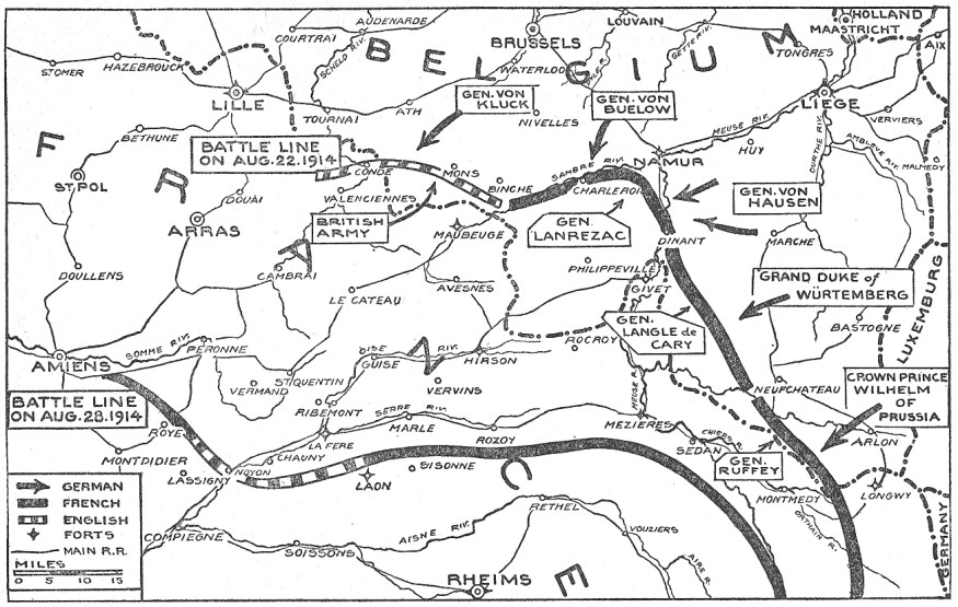 The first great campaign on the western battle grounds in the European War began on August 4, 1914. On this epoch-making day the German army began its invasion of Belgium—with the conquest of France as its ultimate goal. Six mighty armies stood ready for the great invasion. Their estimated total was 1,200,000 men. Supreme over all was the Emperor as War Lord, but Lieutenant General Helmuth van Moltke, chief of the General Staff, was the practical director of military operations. General van Moltke was a nephew of the great strategist of 1870, and his name possibly appealed as of happy augury for repeating the former capture of Paris.