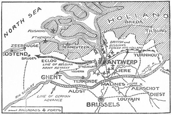 The end being merely a question of hours, General Leman ordered the evacuation of the city by the infantry. He wisely decided it could be of more service to the Belgian army at Dyle, than held in a beleaguered and doomed city. Reports indicate that this retreat, though successfully performed, was precipitate. The passage of it was scattered with arms, equipment, and supplies of all kinds. An ambulance train was abandoned, twenty locomotives left in the railway station, and but one bridge destroyed in rear beyond immediate repair. After its accomplishment, General Leman took command of the northern forts, determined to hold them against Von Kluck until the last Belgian gun was silenced.