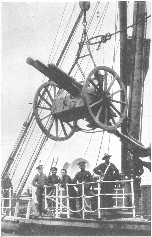 The field gun was of French make; it was a 3-inch quick firer with a maximum range for shrapnel of 6,000 yards, a little over 3-1/2 miles. The Second Ban was armed with old De Bange guns of 8 cm. caliber. The heavy guns, which had done much service outside Adrianople, were of Creuzot make, and included 24 howitzers of 15 cm. and some mortars of 24 cm. As for the aviation wing, there was none.