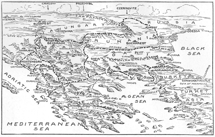 On the morning of July 29, 1914, the day after war had been declared, the residents of Belgrade were startled by a deep roar, followed by the whistling shriek of a huge body hurtling through the air, and a shell burst over the battlements of the old Turkish citadel, doing no damage. Immediately there came another deep shock; the Serbian guns were responding. Thence on the cannonading along the Danube front continued for week after week, with only now and then a lull.