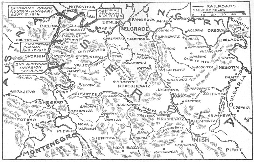 And true enough, next morning, August 18, 1914, shortly after the hot summer sun had risen over the eastern ridges, the Austrians emerged from Shabatz and attacked the Serbians. The Austrian onslaught was furious, so furious that, step by step, the Serbians, in spite of their reenforcements, were driven back. Fortunately toward evening the Austrian offensive began losing its strength, and that night the Serbians were able to intrench along a line from Leskovitz to Mihana.