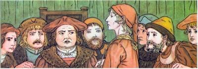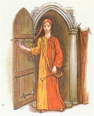 "Come in!"—the Mayor cried, looking bigger: And in did come the strangest figure! His queer long coat from heel to head Was half of yellow and half of red, And he himself was tall and thin, With sharp blue eyes, each like a pin, And light loose hair, yet swarthy skin No tuft on cheek nor beard on chin, But lips where smile went out and in; There was no guessing his kith and kin: And nobody could enough admire The tall man and his quaint attire. Quoth one: "It's as my great-grandsire, Starting up at the Trump of Doom's tone, Had walked this way from his painted tombstone!"