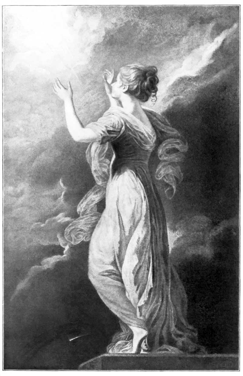 Reynolds tried to put into this figure the various qualities which make up our thought of hope. A pretty young woman steps forth from a region of clouds and lifts her face and hands towards the light. Through an opening in the sky a broad beam of sunshine falls upon her. Following its direction, she seems to be looking through the opening into some glad vision beyond. Like the figure of Hope in Swinburne's sonnet, she