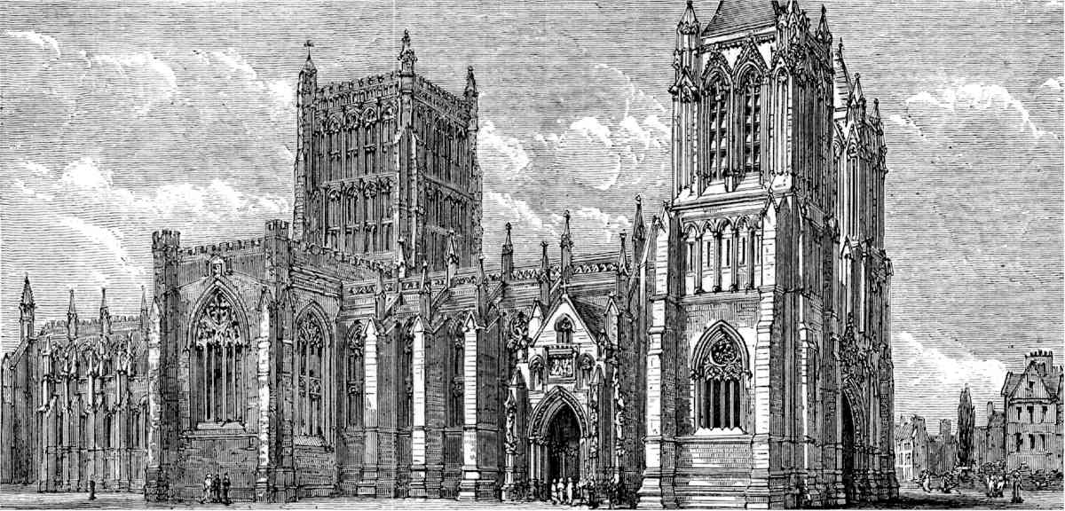The cathedral, "very neat," as Pope expresses it, would be a great treasure in New York, but in England, where Gothic structures so abound, it is far surpassed by several in its vicinity. It has suffered much from iconoclasts, both those who destroy and those who restore. The completion of the nave is now being rapidly pushed forward, and will be followed by that of the towers—good evidence that the Gothic revival in England has not yet spent its force. In its present condition the general effect of the building is disappointing, although there are many admirable details. The chapter-house and the archway below the church are fine relics of its Norman period. In the choir is the tomb of Bishop Butler, author of the Analogy, for twelve years bishop of this diocese. There is also a tablet to his memory, erected in 1834, with an inscription by Southey. Among the monuments one finds two names which shine, it may be said, by reflected light—that of Mrs. Draper, Sterne's "Eliza," and Lady Hesketh, Cowper's devoted friend and cousin. A bust of Southey finds a place here as a tribute of respect in his native town; and the name of Sydney Smith comes to mind, who was a prebendary of this cathedral.