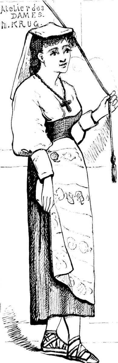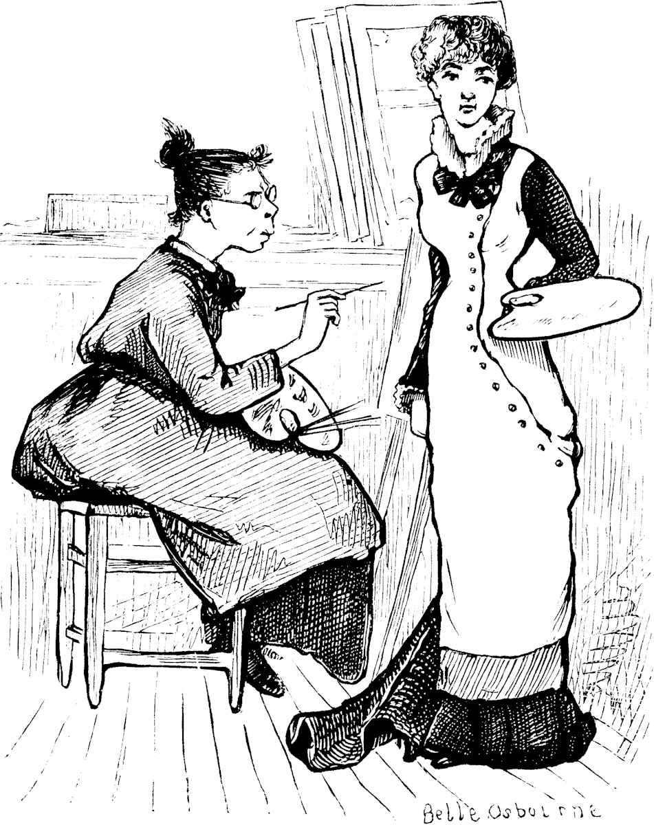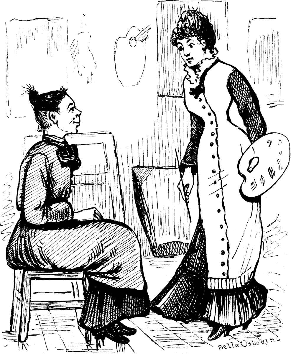 Behold Paletta—twenty-three years of age, with a winy color upon her lips, the faintest perceptible shadow of fading upon the roses of her cheeks, a little anxious wrinkle between her earnest gray eyes, a slight nasal twang in her New England voice, and a fresh flounce upon her old black alpaca dress—the first morning of her experience in an atelier des dames in Paris! She had come down the hill from her dark little room on Montmartre, fancying that the gray December day was crystalline, that the dingy Rue Germain Pillon—with its dirty gamins of both sexes in cropped hair and blouses or white caps and black gowns, its frowsy women slouching in doorways, its succession of odorous cuisines bourgeoises, vile-smelling lavoirs, cheap fruit-shops and plebeian crémeries, its slimy cobblestones, its gutters running not with laughing waters, and sending up scents[Pg 22] not of spicy isles ensphered by sun-illumined seas—was a rainbow arch over which she passed with airy tread toward the Krug studio. For had she not at last finished for ever the detestable photograph-coloring which had been a daily crucifixion of all her artistic feelings for years? Had she not at last reached the Enchanted Land for which she had labored and pined for half her life? Had she not clothes enough to last her with patient mendings and persistent remakings for two years? Had she not a thousand dollars at the Crédit Lyonnais? And did not that stately entrance before her lead into a spacious courtyard, and that courtyard open upon the famous Atelier des Dames, where, at the feet of celebrated masters of form and color, she was to learn some of the mysteries of the art to which she had vowed her life?