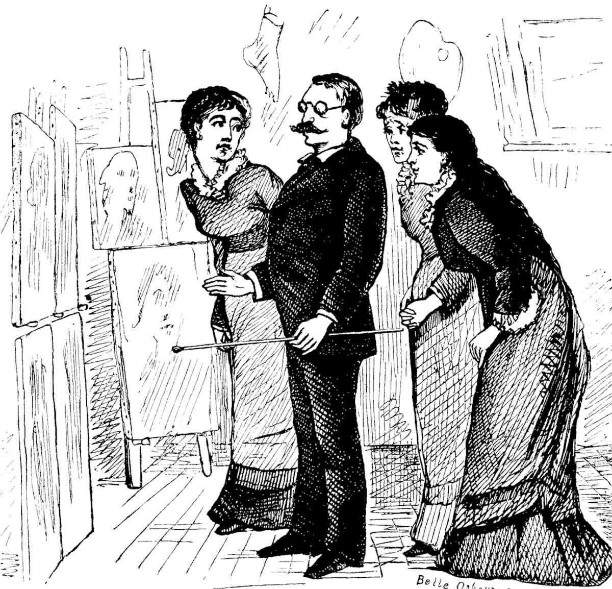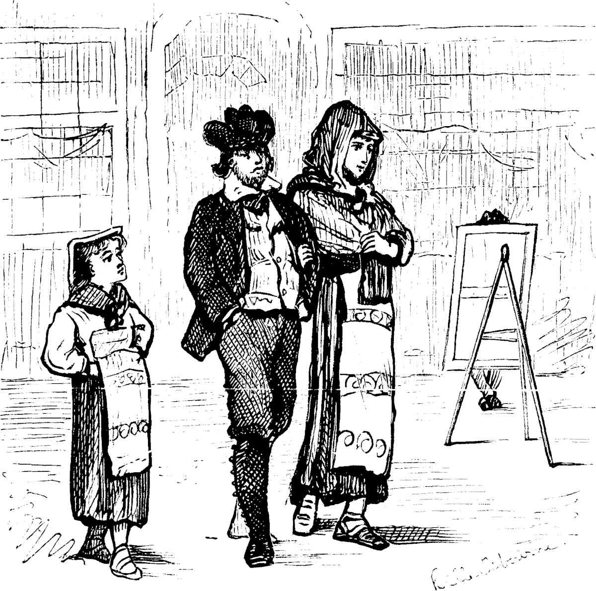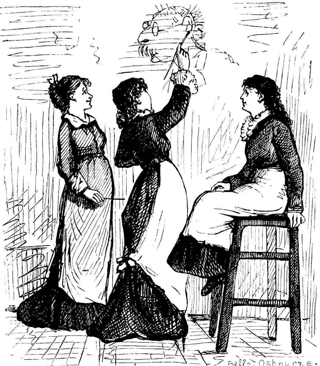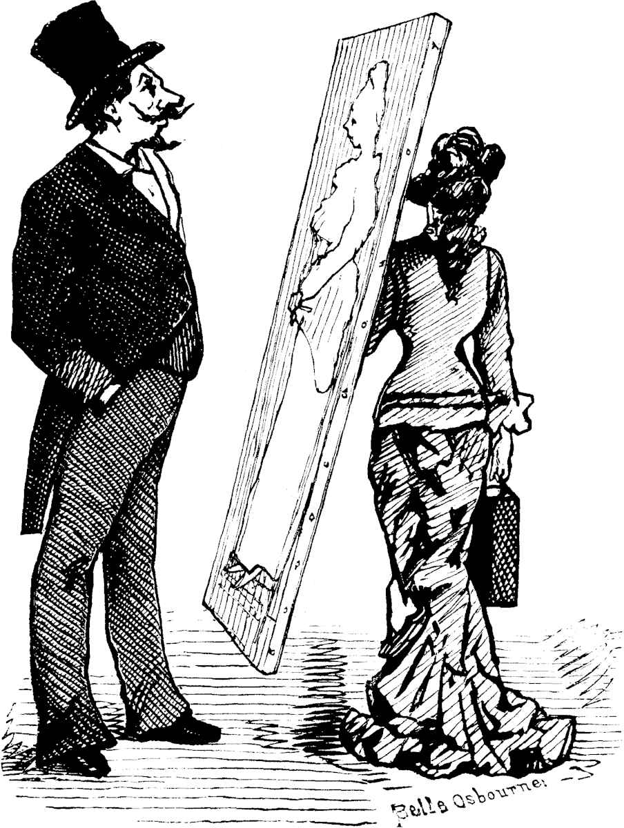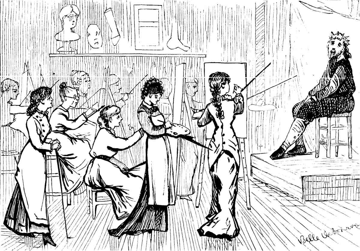 The large room was closely packed with easels—so closely, indeed, that an inadvertent motion of hand or foot often sent a wave of excitement through the whole atelier. Heads of every color, from youthful flaxen to venerable gray, were bent over their labors. Hecubas and Helens worked side by side; maulsticks everywhere gave the scene the appearance of a winter-denuded thicket; plaster hands, feet and torsos hung upon the walls; bull-headed Nero swelled upon a shelf beside the mutilated Venus which is a revelation of the glory that merely human beauty can attain [Pg 23]without a gleam borrowed from the divine; fat Vitellius seemed to snore open-eyed beside lean and wakeful Julius Cæsar; a mask of Medusa leaned lovingly upon the shoulder of Dante; Apollo Belvedere smiled upon an écorché—in atelier parlance "skun man;" finished and unfinished studies of heads, bodies and detached sections of bodies hung from nails in every possible and impossible place. Upon a slightly elevated platform sat the model in his usual street-costume, with oily hair, parted in the middle, falling in long waves upon his shoulders. A spiky circle rested upon his brow, and upon his face was such a stupendous yet futile effort after an expression of divine sweetness and resignation as caused maulsticks to separate themselves every now and then from the denuded thicket and to wabble vaguely about his mouth or play wildly in his hair, accompanied by the commands, "Posez la bouche!" "Posez les yeux!" or, in good American accents, accompanied with a sniff of wrath, "Call him a good Christ? Umph! He'd pose better as a first-class Cheshire cat."