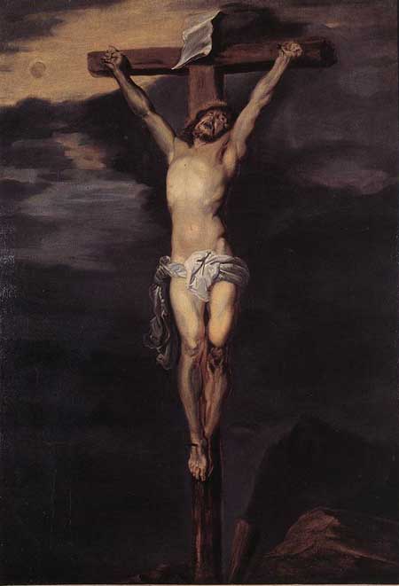 In Van Dyck's picture we see nothing of the surroundings of the Crucifixion—the Roman soldiers, the curious crowd, the sorrowing friends, or the crucified thieves. Only the solitary figure of Jesus, nailed to the cross, is lifted against the strange dark sky. For three hours, as we read, there was darkness over all the land, followed immediately, after the death of Jesus, by a great earthquake. This is the moment when the storm-clouds are gathering over the face of the sun, causing its light to gleam luridly through the thick covering. The cross is rudely built of two beams in the form which is called a Latin cross. A fluttering scroll at the top of the upright beam carries the accusation "The King of the Jews."