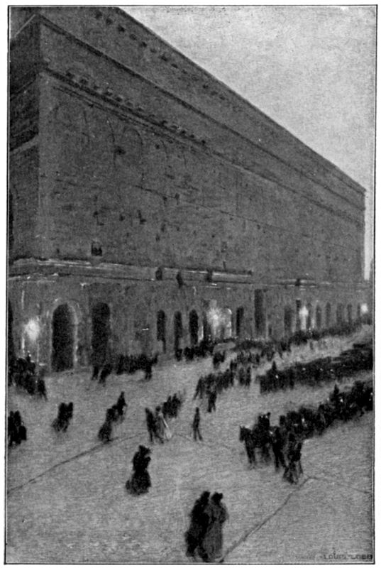 Naturally, the third-class seats were the most in demand; and from the moment that the gates were opened the way to them was thronged: an acute ascent—partly rough stairway, partly abrupt incline—which zigzagged up the hill between the wall of the theatre and the wall of an adjacent house and which was lighted, just below its sharpest turn, by a single lamp pendant from an outjutting gibbet of iron. By a lucky mischance, three of the incompetent officials on duty at the first-class entrance—whereat, in default of guiding signs, we happened first to apply ourselves—examined in turn our tickets and assured us that the way to our second-class places was up that stairway-path. But we heartily forgave, and even blessed, the stupidity of those officials, because it put us in the way of seeing quite the most picturesque bit that we saw that night outside of the theatre's walls: the strong current of eager hu[236]manity, all vague and confused and sombre, pressing upward through the shadows, showing for a single moment—the hurrying mass resolved into individual hurrying figures—as it passed beneath the hanging lamp, and in the same breath swept around the projecting corner and lost to view. It looked, at the very least, treasons, conspiracies, and mutinous outbursts—that shadowy multitude surging up that narrow and steep and desperately crooked dusky footway. I felt that just around the lighted turn, where the impetuous forms appeared clearly in the moment of their disappearance, surely must be the royal palace they were bent upon sacking; and it was with a sigh of unsatisfied longing that I turned away (when we got at last the right direction) before word came to me that over the swords of his dying guardsmen they had pressed in and slain the king!