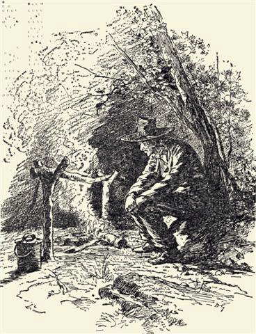 Hardly had he spoken when bang came a shot from beyond the fire; a bullet zipped past his head and flattened on the rock well back in the cave. Where could that have come from? was the question. A little whiff of blue smoke sailing away on the wind from the fork of a tall oak not fifty feet in front told the story. Hidden from view of the besieged by the drifting smoke from the fire a young warrior had clambered until he reached the crotch and there had drawn up the rifle and belt tied by his comrades to a "lariat." Straddling a convenient branch and lashing himself to the trunk he was now in such a position that he could peer around the tree and aim right into the mouth of the rocky recess, and only one leg was exposed to the fire of the defense.