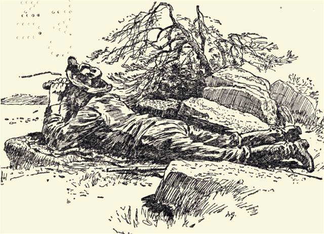 "Now, Jim, it won't be long before they will be showing around on all sides. Pile on a few more stones above that loophole that looks to the west. The next thing you know there'll be a head and a gun poked out from behind that shoulder of rock beyond you. I'll watch my side and keep a look on down the hill, too."