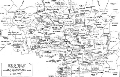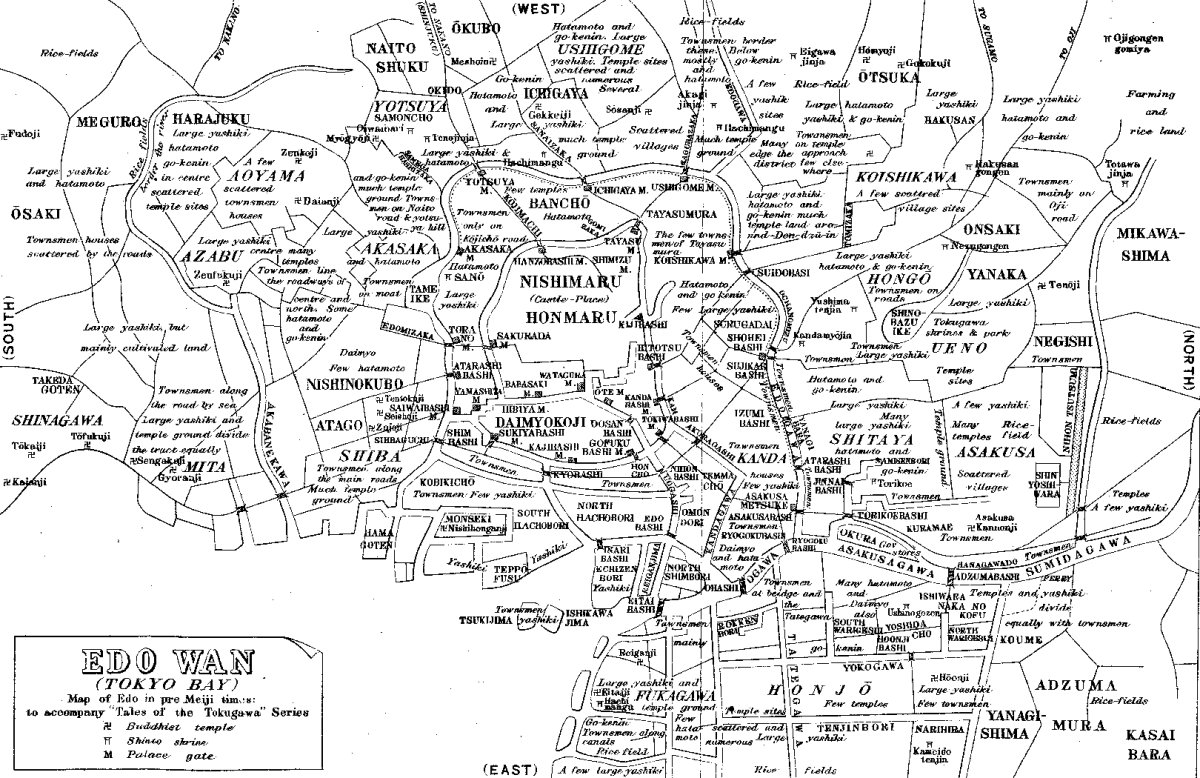 The outline of the map is that found in Volume I. of the Edo Sunago, published Keio 2nd year (1866). The detail of district maps found in the book is worked in, together with that from the sectional map of Edo published Ansei 4th year (1857), and from the Go Edo Zusetsu Shūran published Kaei 6th year (1853). The map therefore shows in rough outline the state of the city just before the removal of the capital from Kyōto; the distribution of the castes.