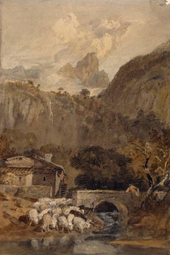 99. The scene is one which, in old times of Swiss traveling, you would all have known well; a little cascade which descends to the road from Geneva to Chamouni, near the village of Maglans, from under a subordinate ridge of the Aiguille de Varens, known as the Aiguillette. You, none of you, probably, know the scene now; for your only object is to get to Chamouni and up Mont Blanc and down again; but the Valley of Cluse, if you knew it, is worth many Chamounis; and it impressed Turner profoundly. The facts of the spot are here given in mere and pure simplicity; a quite unpicturesque bridge, a few trees partly stunted and blasted by the violence of the torrent in storm at their roots, a cottage with its mill-wheel—this has lately been pulled down to widen the road—and the brook shed from the rocks and finding its way to join the Arve. The scene is absolutely Arcadian. All the traditions of the Greek Hills, in their purity, were founded on such rocks and shadows as these; and Turner has given you the birth of the Shepherd Hermes on Cyllene, in its visible and solemn presence, the white cloud, Hermes Eriophoros forming out of heaven upon the Hills; the brook, distilled from it, as the type of human life, born of the cloud and vanishing into the cloud, led down by the haunting Hermes among the ravines; and then, like the reflection of the cloud itself, the white sheep, with the dog of Argus guarding them, drinking from the stream.