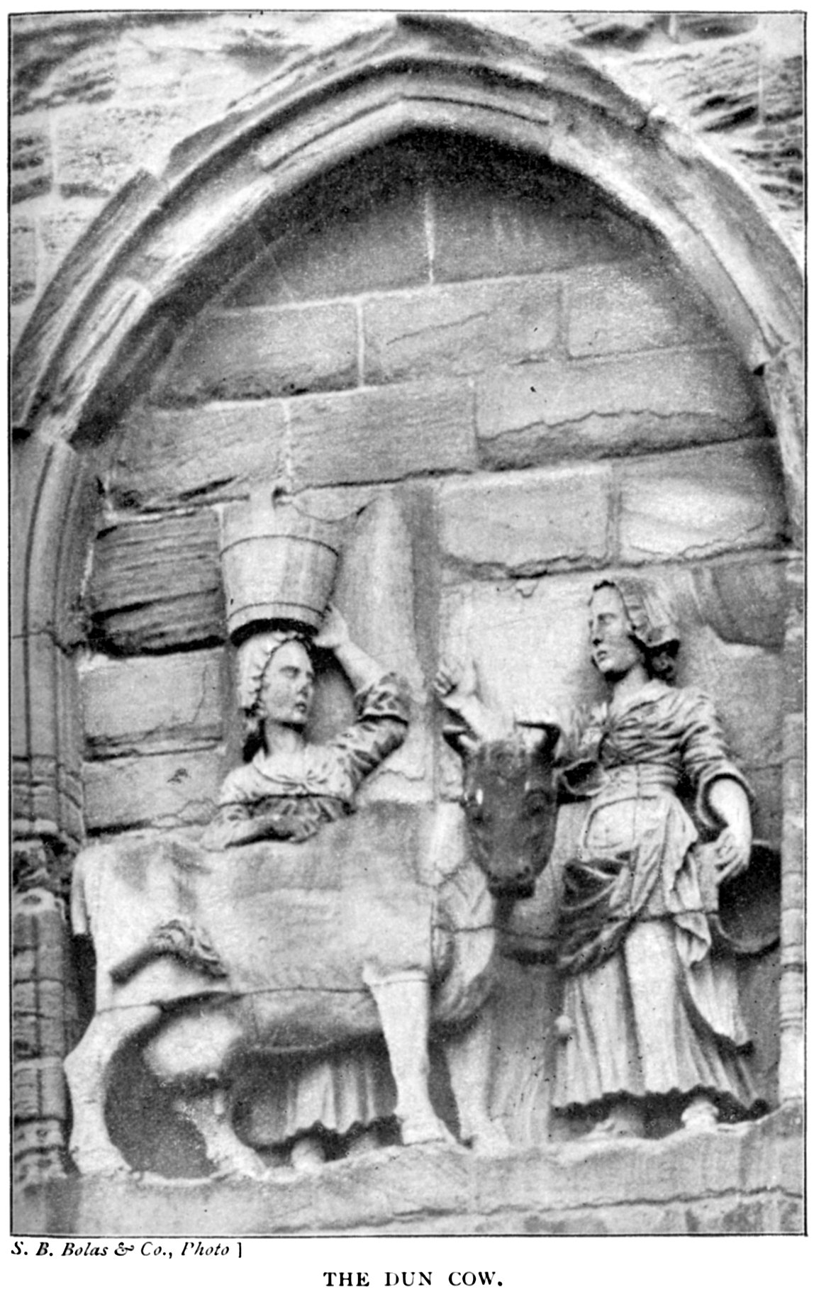 A sculptured panel on the north-west turret of the Nine Altar Chapel is now known as the Dun Cow. The original sculpture was replaced in the last century by the existing panel, but the legend connected with it is interesting. After their flight from Chester-le-Street, the monks, bearing the body of S. Cuthbert, remained some time at Ripon. While trying to return to Chester-le-Street, at a place called Wardlaw, the coffin stuck fast, and remained absolutely fixed. A fast of three days was proclaimed and kept, when it was revealed to them that they were to carry their saint to Dunholme. Still they were in difficulties, not knowing where Dunholme was, but fortune, or Providence, again favoured them. A woman, who had lost a cow, passed, calling to a companion to inquire if she had seen the animal. The reply was that her cow was in Dunholme; and, to the relief of the monks, they and their precious charge soon safely arrived there. In grateful 36 commemoration of the incident Flambard erected this monument of a milkmaid and her cow. (See p. 9.)