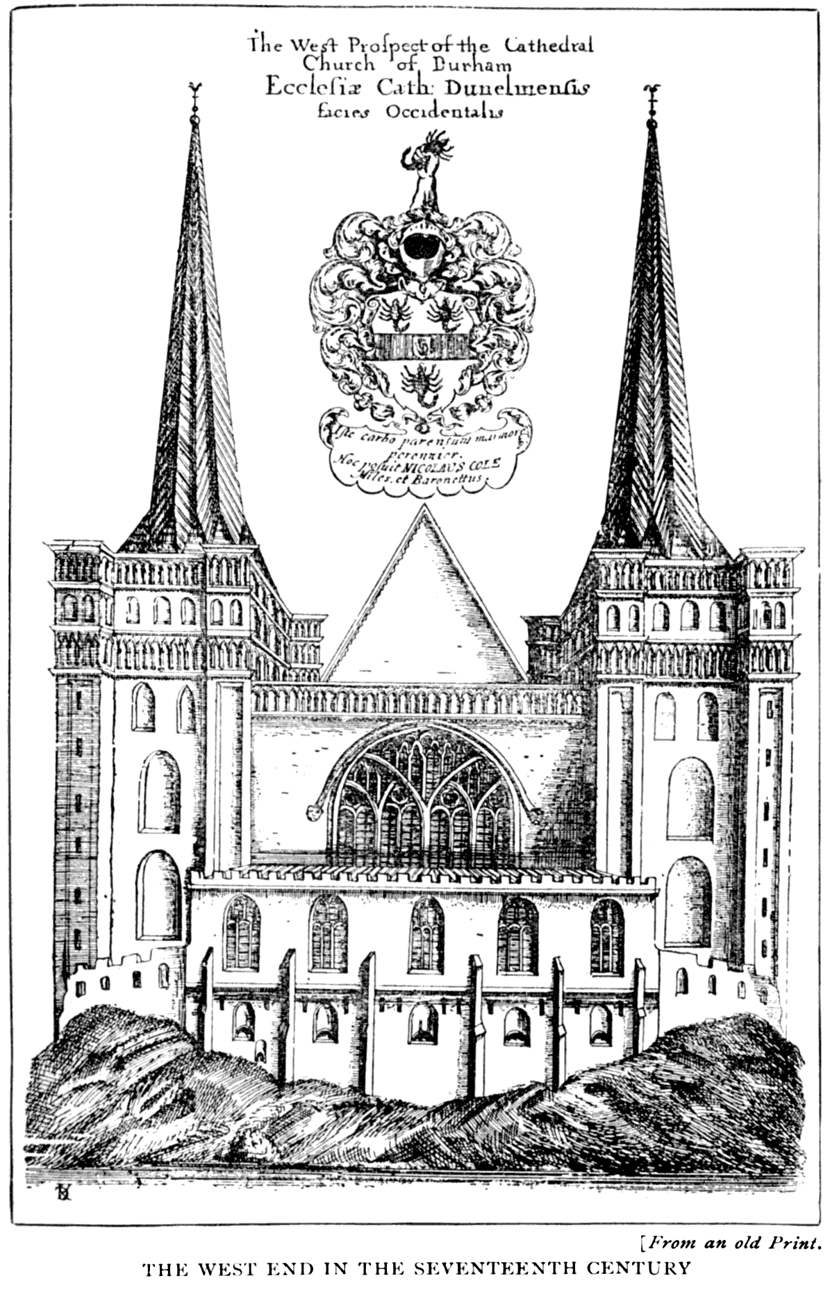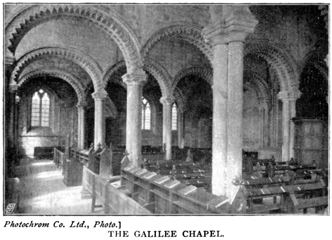 The West Front of Durham has, curiously enough, also lost its original character. The western doorway of the cathedral is hidden on the exterior by the Galilee or Lady Chapel, which was added by Pudsey in 1175. Above the Galilee roof is the large window inserted about the year 1346, while John Fossor was prior. The pointed arch of this window has over it, on the exterior, the original great semi-circular arch. Above this again, and between the two flanking western towers, is a small gable. The west end of the cathedral, when seen from the opposite side of the river, is extremely picturesque. The projecting mass of the Galilee, the western towers, the foreshortened nave roof, and the majestic central tower behind and above, form a group of high and rare excellence.