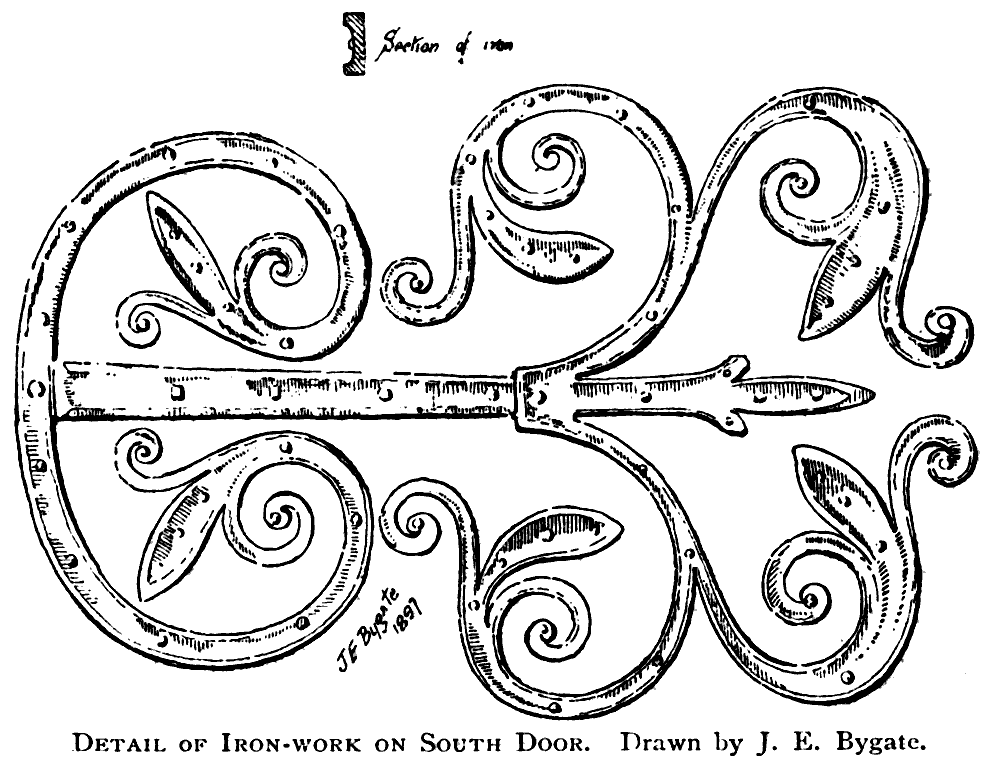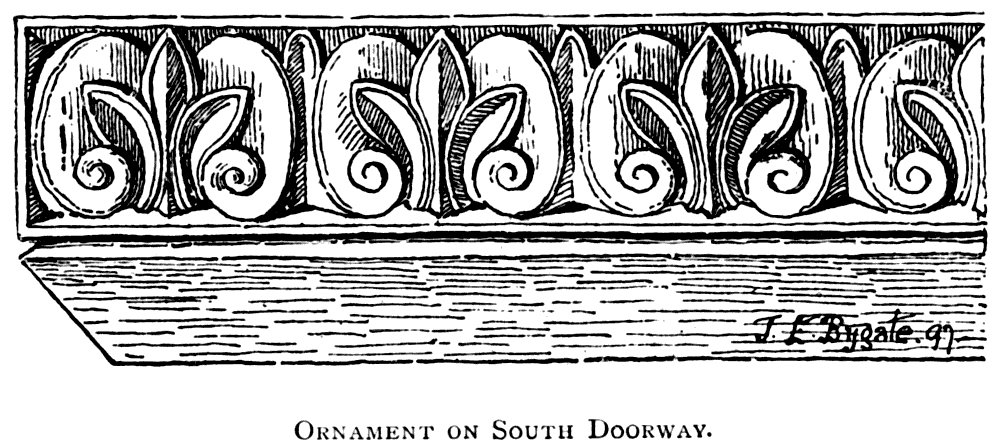 The South Doorways.—There are two doorways into the south aisle, one, known as the Monks' Door, opening from the western portion of the cloisters and immediately opposite the north porch just described. On the cloister side this shows a Norman arch resting on double shafts, which are enriched with a lozenge pattern. 28 On the inner or aisle side there are two orders, with shafts in the recesses, which are also decorated with the lozenge. The inner arch is carved with chevrons, and the outer with conventional foliage and medallions. The capitals are richly carved with foliage and grotesques. On the abacus and arch of this doorway occurs a leaf pattern strongly suggesting the Byzantine influence which at one time was found in Norman decoration. Here again, on the door itself, we have a fine specimen of very elaborate and characteristic Norman iron-work. The second, known as the Priors' Door, opens into the south aisle from the eastern alley of the cloister, is also Norman. The outer or cloister side is of the time of Bishop Pudsey, and has an arch of four orders, with three shafts in the recesses on either side. Its once elaborate sculpture is now much decayed, not enough remaining to suggest that in its original state this doorway must have been a noble specimen of the architectural design of its period. On the inner side it exhibits work of Carileph's time, with an early arch, cushion capitals, and shafts.