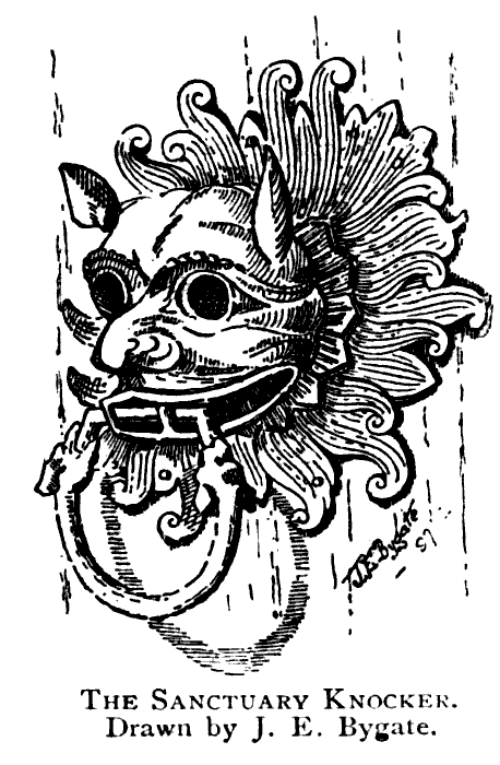 The North Door is now the principal entrance to the cathedral. Externally the present porch is the work of Wyatt. The first porch was Norman, of four orders depth, with detached shafts in the recesses. Above this was a high-pitched gable and roof, the front being ornamented with a semi-circular-headed wall arcading. The inner side of the doorway is of two orders only, and is probably the only remaining portion of the original. The outer shaft is left plain, while the inner one, in each case, is most elaborately carved. The capitals are all carved, and the arch moulds richly ornamented with chevrons, foliage, and lozenges, as well as many curious figure subjects. While examining this doorway, notice should be taken of the ironwork of the door itself, and particularly of the sanctuary knocker. In mediæval times all churches afforded sanctuary to wrong-doers, but at places where the shrines of saints existed the sanctuary privileges were much greater. Durham being one of these, there are many curious cases on record of persons claiming the privilege, and protection from the secular law. The earliest instance, of which any record has been kept, of sanctuary being claimed at the shrine of S. Cuthbert is during the episcopate of Cynewulf, who was bishop from 740 to 748, and the last recorded was in 1524. Criminals claiming 26 sanctuary were admitted by two janitors, who occupied two small chambers over the doorway, traces of which may still be observed. The knocker itself, as may be seen from the illustration, is a great grotesque head, made of bronze, and hanging from its grinning mouth is a ring. Originally, there is no doubt, the eyes were filled with crystals or enamel, as small claw-like pieces of bronze remain by which the filling was attached. The age of this piece of work is probably the same as that of the doorway itself.27