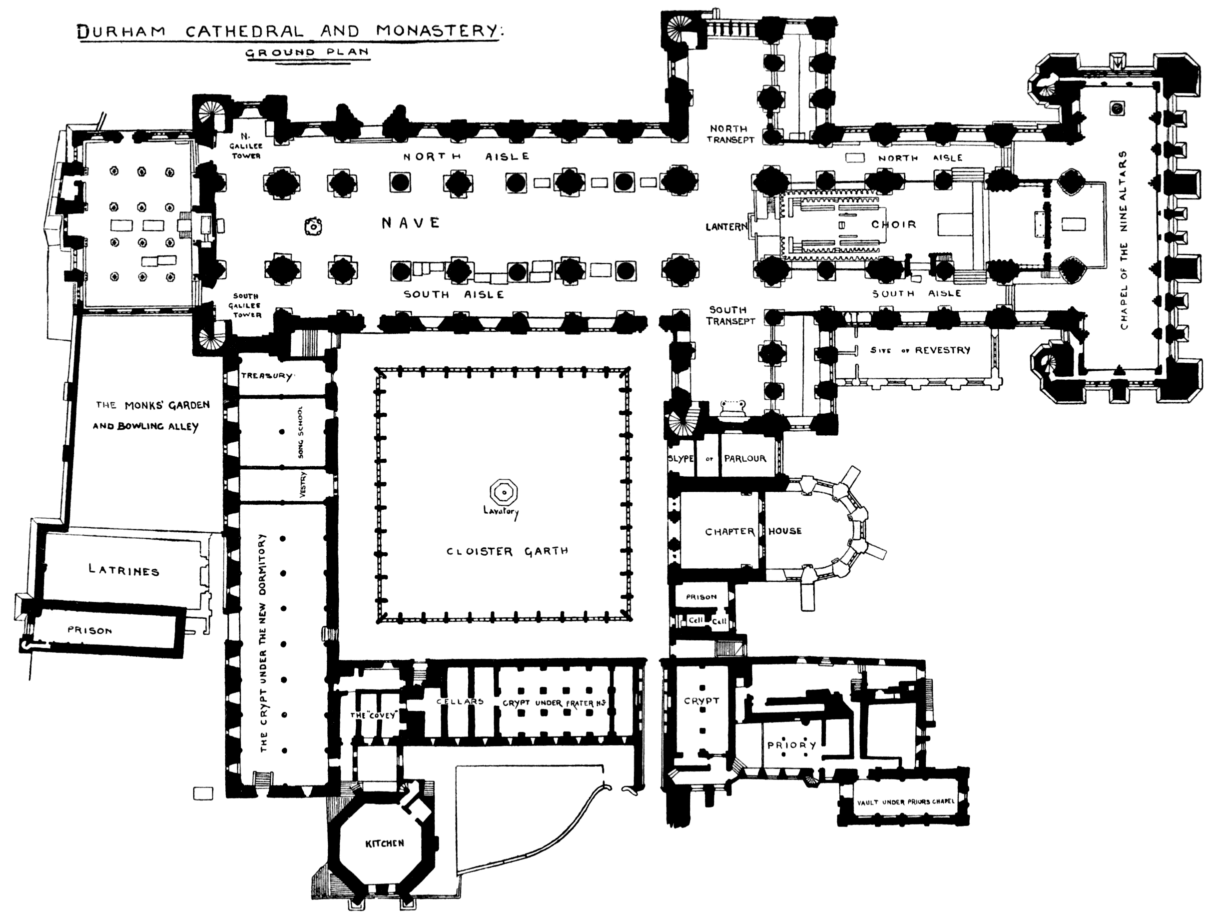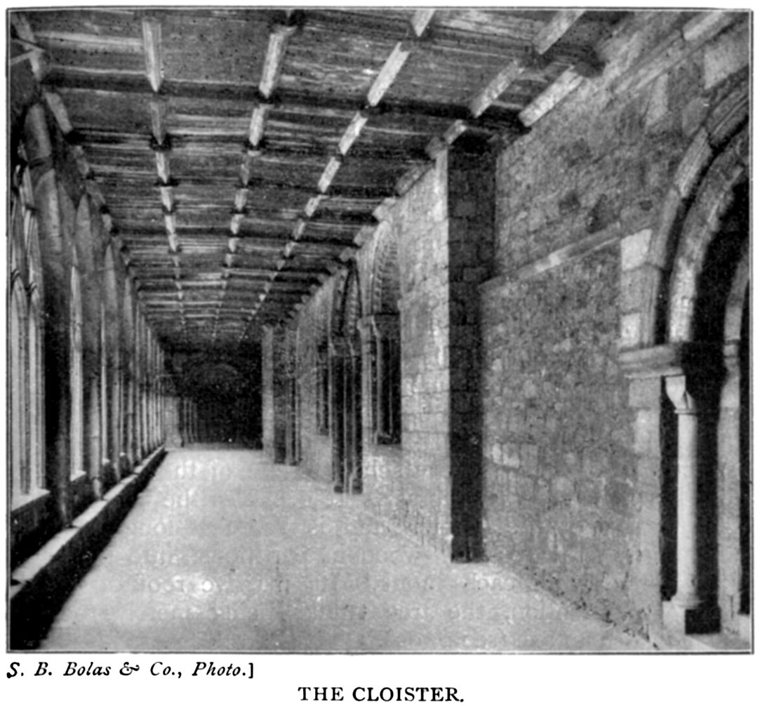 The Cloister occupies a large open space, bounded on the south, east, and west by the various monastic buildings, and on the north by the cathedral itself. The existing cloister was commenced during the time of Bishop Skirlaw (1388 to 1406), and was completed by Cardinal Langley (who held the see from 1406 till 1438), probably in the earlier part of his episcopate. The contracts (the first dated 1398) for building the cloister are still preserved in the treasury. We are indebted to Bishop Skirlaw for their very existence, as it is recorded that he contributed sums of money for this purpose, both during his life and by his will. The cloister, as seen to-day, has been very much altered and restored, and probably the only original 30feature remaining is the fine oaken ceiling. This is panelled, and moulded, and decorated with shields, upon which are painted and gilded various coats of arms. In the centre of the cloister garth are the remains of what was the monks' lavatory. It was erected in the years 1432 and 1433, and was of octagonal shape. Some of the stone for its construction was brought from Egglestone-on-Tees, on payment of rent to the abbot of that place to quarry it. It is said to have had twenty-four brass spouts, seven windows, and in its upper storey a dovecote, the roof of which was covered with lead.