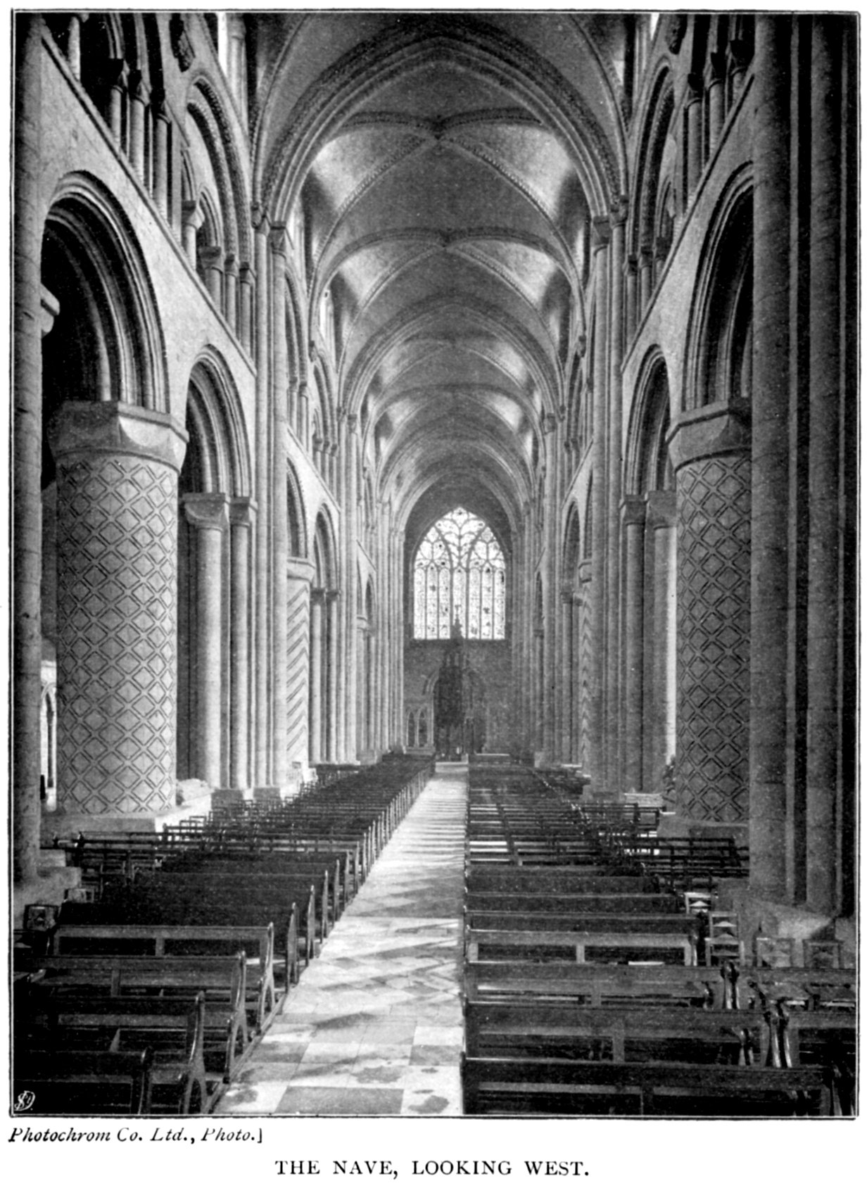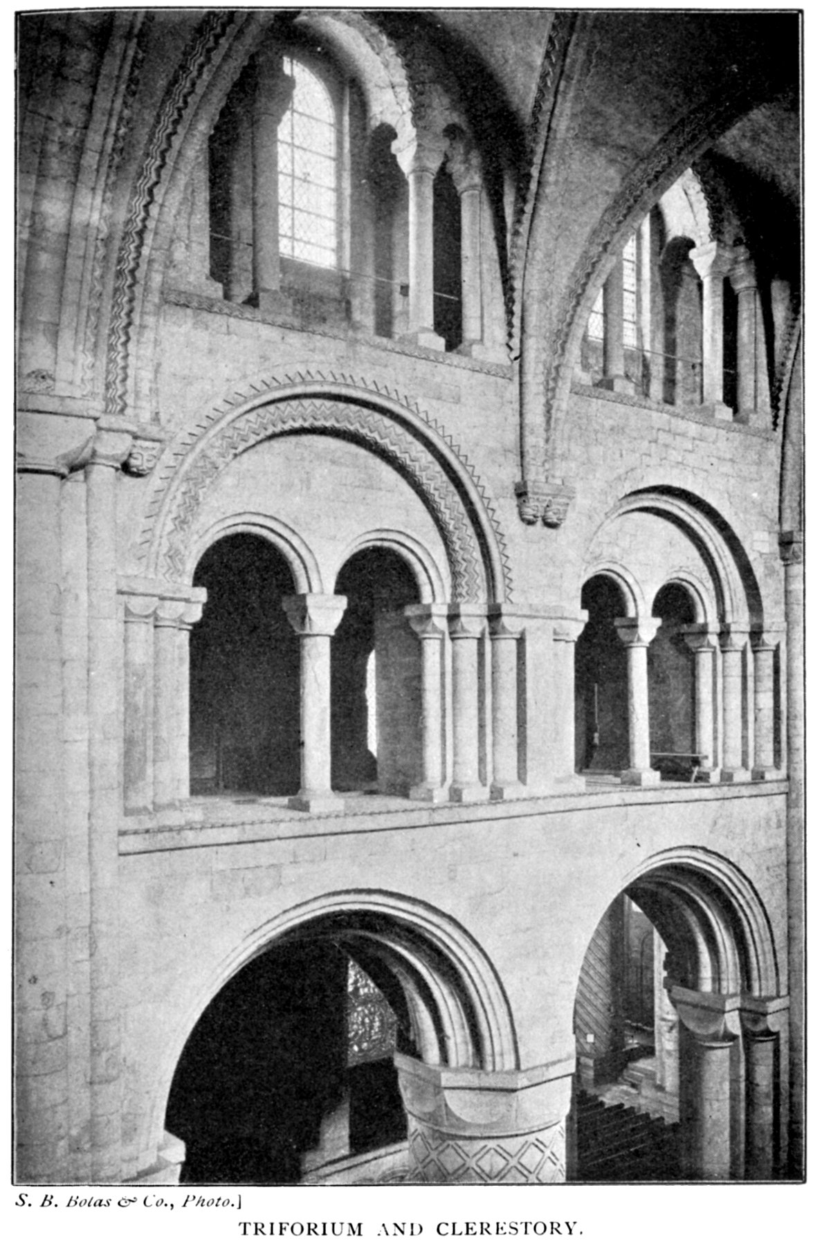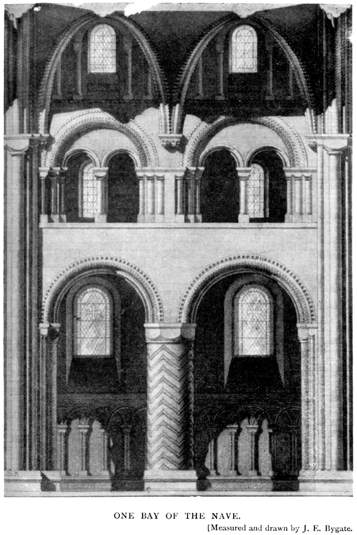 Each bay of the Nave is divided into two sub-bays. The main bays have massive piers with engaged shafts on the recessed faces. The bases of these are cruciform in plan, though the arms of the cross are very short. At the height of the springing of the arch the shafts are surmounted by plain cushion capitals. The division into sub-bays is effected by the introduction midway of a massive round column on a square base. These columns are ornamented in various ways, by channels cut on the face. Some take the form of a zig-zag, some a spiral, others a spiral in two directions, forming a trellis-like pattern, and others again are reeded vertically. Their capitals are octagonal cushions. The arches of the sub-bays 40 are recessed square, with the usual Norman roll moulding, decorated with chevrons, and on the wall face a square billet. The chevron ornament is absent in the earlier work in the choir and transepts. The triforium is almost uniform throughout the whole church. In each sub-bay it consists of two small arches under one larger one, with the tympanum solid. Here also the capitals are cushions and perfectly plain.
