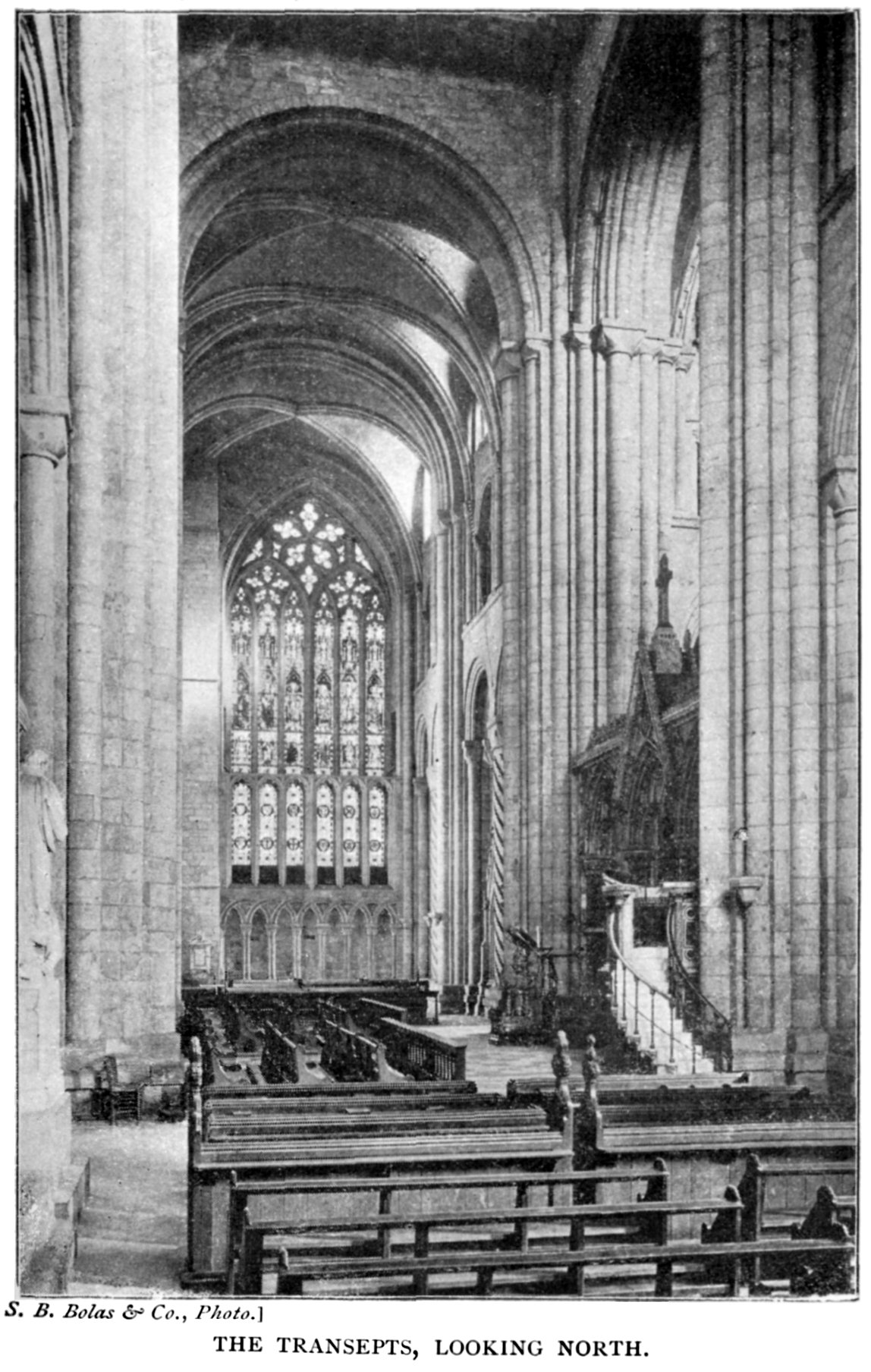 The East Front.—The circumstances which led to the removal of Carileph's apses and the erection of the eastern 25 transept have already been referred to. The present east end is divided into three bays by massive buttresses, each of which contains three lofty lancet windows separated by smaller buttresses. Over all, and in the gable, is the famous large rose window. The north and south ends of the transept are finished with the tall pyramidal pinnacles erected by Wyatt.