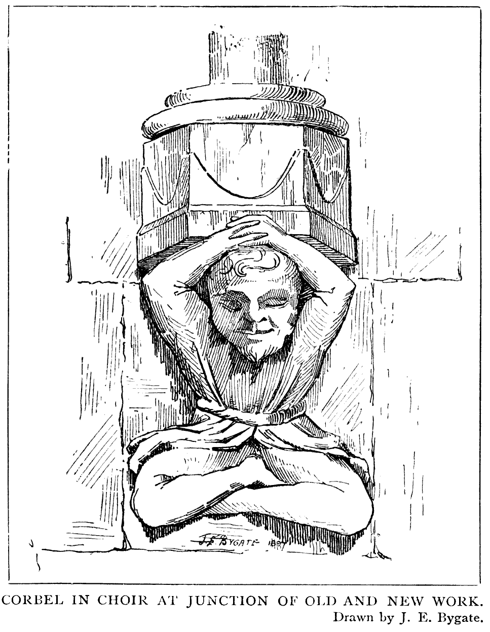 The Central Tower.—The present central tower is noble 22 in proportion, and forms a fitting and harmonious summit to the whole group. It must needs be of a very different character from the old Norman tower, of which no trace now remains; and was most probably of the usual type, low and square, and surmounted by a short pyramidal spire. The existing structure may be attributed to Bishop Booth and Prior Richard Bell, about 1474, when the letter previously quoted was written. Externally the tower is divided into two storeys. The lower portion contains, on each side, a pair of two-light windows, glazed, each divided by a transom, and their heads having an ogee label crocketed and finished with a tall finial also crocketed. Between and on either side of these windows are panelled pilasters and brackets carrying figures. The lower and upper stages are divided by a narrow external gallery running round the tower, and protected by a pierced, embattled parapet. This is known as the Bell Ringers' Gallery, and certainly adds greatly to the effect of the tower as a whole. The upper stage, which is much less lofty, has also two two-light windows on each face, surmounted by crocketed ogee label mouldings and finials. These lights are louvred. The whole is surmounted by a deep open-work parapet. On each angle of the tower are two buttresses, which are decorated with panelling and canopied and crocketed niches containing figures. The interior of the tower or lantern is remarkable for the gallery which runs round it, which is reached from the roofs of the nave and choir transepts by doors. It rests on corbels, each alternate one being carved with grotesque heads, and is protected by a parapet pierced in quatrefoils. The four doorways are ogee-headed, with crockets and finials. There is strong evidence in the construction of the present tower that it was the original intention to surmount it by some other erection, probably a spire. Each interior angle contains strong and massive squinches which are of no constructive use at present, and must have been originally inserted to carry some superstructure. The buttresses at the angles are also carried up to the parapet, which would seem to point to the same conclusion. Why this project was never carried out cannot be said, but probably it would not have added to the artistic effect of the tower. The belfry contains a peal of eight bells.23