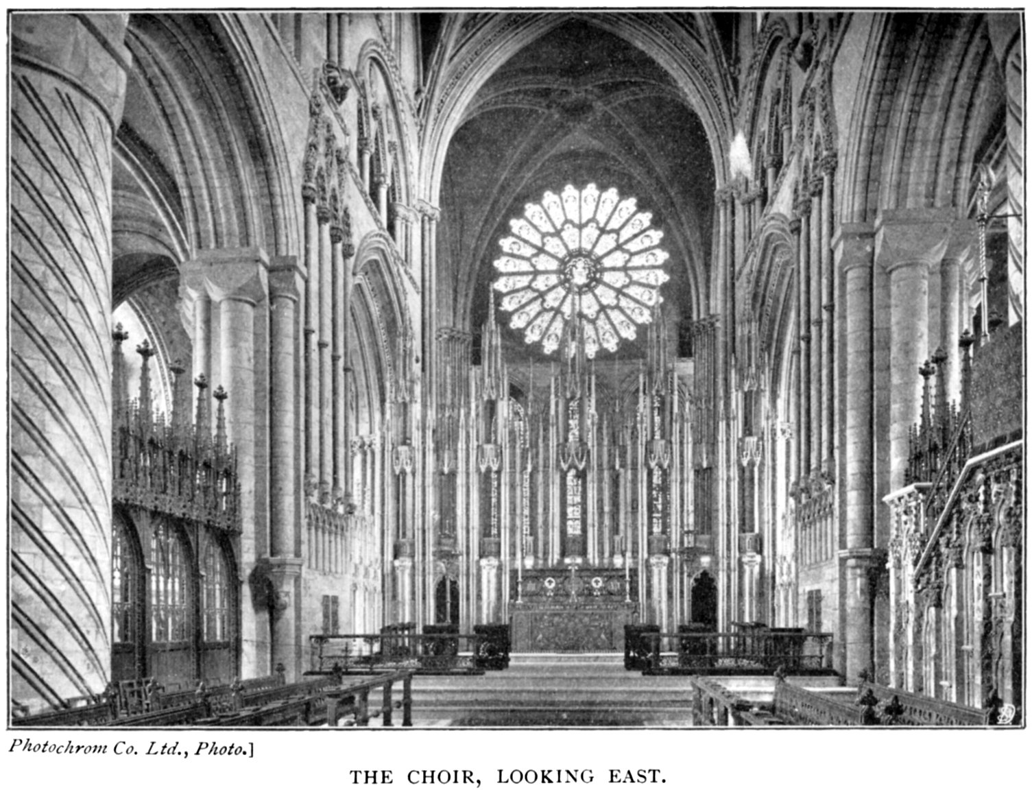 The new Choir Screen is very much open to criticism. Though no doubt beautiful in detail, and of excellent workmanship, its effect, as a whole, is not pleasant, when seen from the west end silhouetted against the light of the choir. A screen previously existed in this position erected by Bishop Cosin. This was removed in 1846, with the idea of improving the appearance of the church from the west end by obtaining a "vista" through to the Neville screen and rose window of the eastern transept. The effect seems, however, to have been disappointing, hence the erection of the present screen, which may or may not have improved matters. In the two western piers of the choir holes may be seen cut in the stonework. These received the rood-beam from which, during Lent, the Lenten curtain was suspended.45