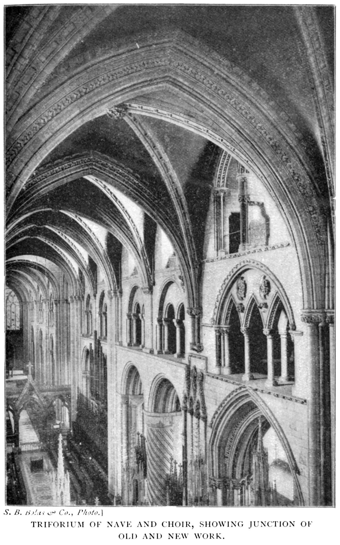 The Choir is the earliest part of the church. Its two western bays show Carileph's work, but the eastern piers have been considerably altered owing to the addition at a later period of the eastern transept, when Carileph's apses were taken down. This bay contains some very rich and beautiful detail. The piers on either side of the choir are decorated with arcades, the lower stage having six arches, and the upper three, all richly carved with foliage in the caps and hood moulds, and with heads and half figures. There is also a square aumbry on each pier. Above the upper arcade, which breaks through the level of the triforium string course, which is also carried round it, there is on each pier a figure of an angel beneath a canopy. These are the only two figures remaining of many which formerly added to the beauty of the interior of the church. The vaulting of the choir is thirteenth-century work, quadripartite, the ribs decorated with dog-tooth ornament and square leaves, and has fine bosses at the intersections of the diagonal ribs. The choir of Durham is especially interesting to the student of architecture, showing as it does the Early Norman work of Carileph, combined with the Early English and Early Decorated work of the newer eastern portion.41