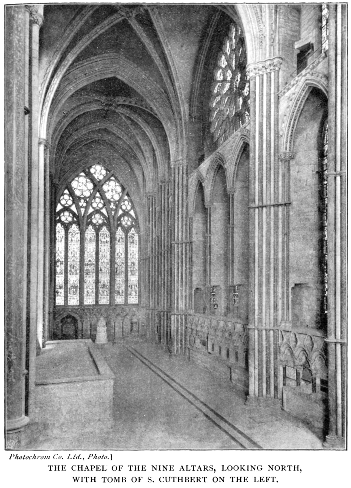 The eastern termination of Carileph's choir had been apsidal; it was found to be in a very unsafe condition, cracks and fissures appearing in the walls. Various bishops and priors 14 sent aid towards "the new work," but actual building did not commence until after the death of Bishop Poore in 1237. The erection was commenced by Prior Melsanby and, of course, necessitated the taking down of Carileph's apses. The revaulting of the choir was undertaken at this time, doubtless, for artistic reasons, to bring the new work into harmony with the old. The Chapel of the Nine Altars is a rare and valuable specimen of Early English Gothic architecture of remarkable and graceful design. Below each of its nine lancet windows was originally an altar, dedicated to different saints. Its great height was obtained by lowering the floor, so that the unity of the whole exterior should not be destroyed. Prior Melsanby is also said to have put a new roof on the church.