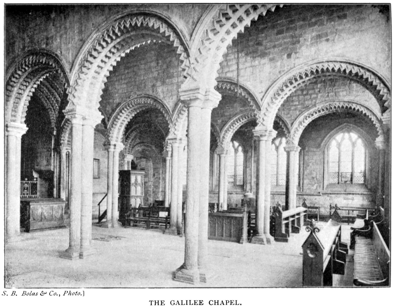 What was originally Pudsey's Upper Hall is now styled the Norman Gallery. The greater portion of this gallery is at the present time divided into chambers of residence for the students of the university. It is reached by the Black Staircase and a doorway in the Early English Gothic style. The 105 interior of the south and west walls are enriched by arcades in groups of three, the central bay of each of which is larger than those flanking it, and is pierced by a window. The arches of the arcade rest on shafts and cushion capitals, and are carved with chevron ornament. The whole arrangement hereabouts bears the impress of having been a portion of one great building, which an examination of the roof, lead, and general outline makes even more certain.