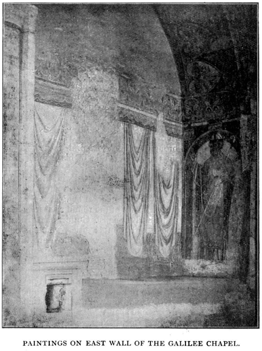 43 On the south side of the choir stands the monument of Bishop Hatfield, who directed the see of Durham from 1345 until 1381. This monument is beneath the Episcopal Throne, which was erected by Bishop Hatfield himself. It consists of an altar tomb surmounted by a recumbent effigy of the bishop, in richly-worked robes, beneath a canopy, richly groined, with foliated bosses at the intersections of the ribs. On the walls at the east and west ends may still be seen the remains of fresco painting, representing in each case two angels. Beneath the staircase leading up to the throne is a very fine decorated arcade, containing several shields bearing the bishop's and other arms. The whole structure was originally richly coloured and gilded, and remains of this work can still be made out. It is a noble specimen of the work of its date.