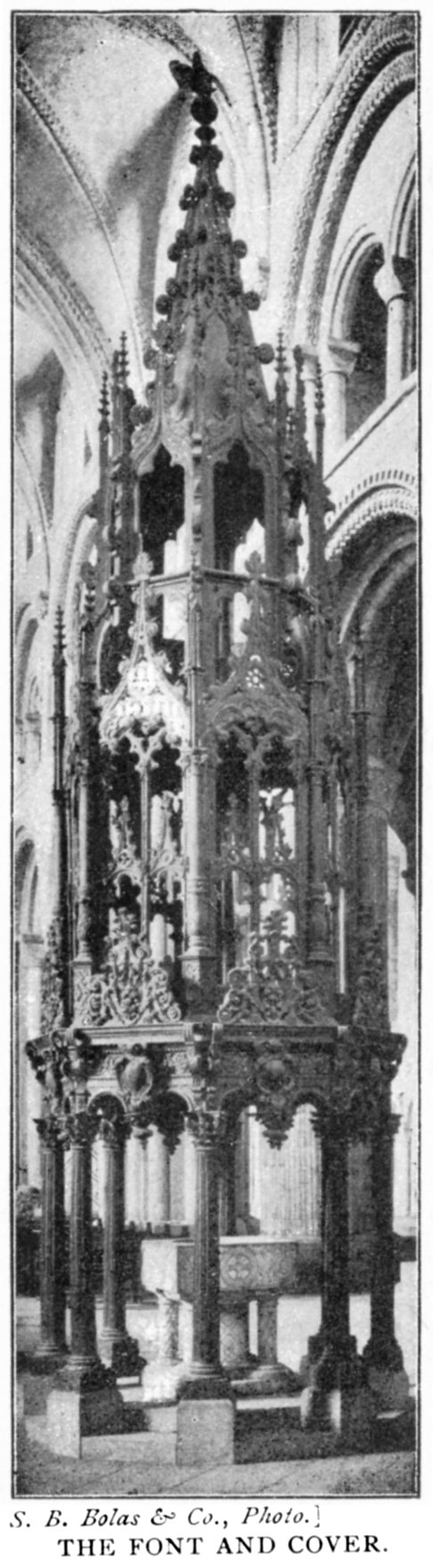 The beautiful altar screen is usually known as the Neville Screen, and was erected about the year 1380, mainly from moneys supplied by John, Lord Neville of Raby. It spans the whole of the choir, and is continued along the sides of the sacrarium, forming sedilia of four seats on either side. It is pierced by two doors, which lead to the shrine of S. Cuthbert, immediately behind the screen. Though very light and graceful in appearance, the screen, as it is at present, can give the beholder little idea of what its appearance must 44 have been when each of its canopied niches contained a figure aglow with gold and colour. There were originally 107 of these statues, the centre one representing Our Lady, supported on either side by S. Cuthbert and S. Oswald. Unfortunately none of the figures remain in situ.