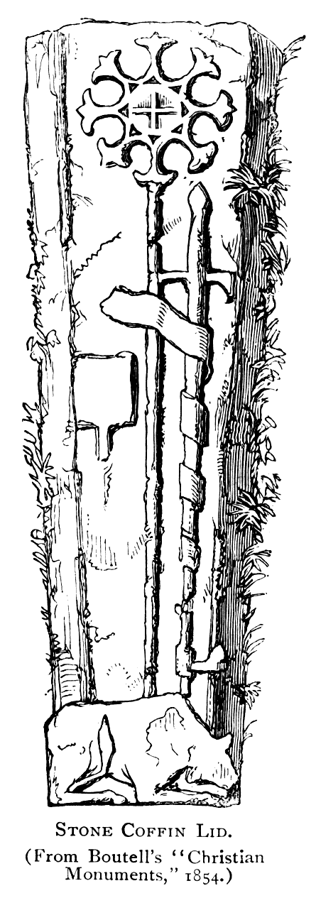 S. Oswald.—This church stands on high ground overlooking the river Wear, at the head of New Elvet; and is the parish church of the ancient borough of Elvet. The first church was erected by Bishop Carileph, though the earliest 112 parts of the existing building are of the time of Bishop Pudsey, who also built the bridge across the river, known as the Elvet Bridge. To this date (about 1190) belongs the eastern part of the nave arcade, the arches of which are semi-circular and rest upon tall round piers. Early in the fourteenth century a new chancel was built, the aisles rebuilt and extended to the west end, and two new arches added to the west end of the nave arcades. In the early part of the fifteenth century a clerestory and open parapet were added, and a new oak roof placed over the nave. This was most probably a hammer-beam roof, and was coloured and gilded and decorated with angels holding shields. The only parts remaining at the present day are the grotesque carved corbels, and the angels. The tower was also constructed at this time. In 1834, owing to subsidence of the ground, it became necessary to rebuild the south aisle and a large part of the chancel, which caused the destruction of much architectural beauty. The open parapet was removed, the clerestory windows replaced by the present inferior ones, and the fine oak roof destroyed. The east end of the chancel was rebuilt in 1864. Special attention should be directed to the fine oak stall-work in the chancel, boldly carved in the style of the early part of the fifteenth century. The tower, which forms a beautiful and conspicuous landmark, is reached by a stone staircase of unusual character. It is placed in the thickness of the wall, and is covered in with twenty-four gravestones of thirteenth and fourteenth century date, on which may yet be seen portions of inscriptions and symbols. Built into the tower was part of a Saxon cross, which has now been removed for preservation to the dean and chapter library. This cross is interesting as evidence of the existence on the same site of a pre-Norman church. The tower was carefully restored in 1863. It contains a peal of six bells, which were re-cast in 1694, and bear the following inscriptions:—