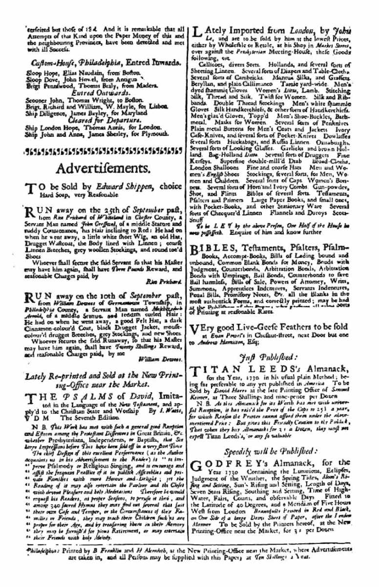 Pages 1 and 4 of The Pennsylvania Gazette, Number XL, the first number after Franklin took control |
