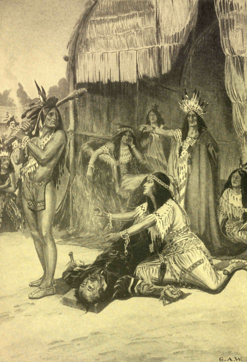 Through Orapakes and Pamunkey and other forest settlements a long line of fierce warriors were marching Indian file, on their way to Werewocomoco, leading a captive white man to Powhatan for inspection and for sentence. As the warriors passed into the Indian village, they encountered crowds of dusky braves and tattooed squaws hurrying along the wood trails, and when they halted at the central clearing of the village, the crowd closed in around them to get a better view of the captive. At the same time there rose a wild clamor from the rear of the throng as a merry group of shrieking, shouting girls and boys darted forward, jostling their way through the crowd.