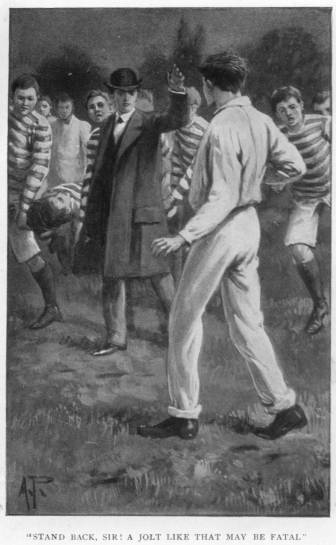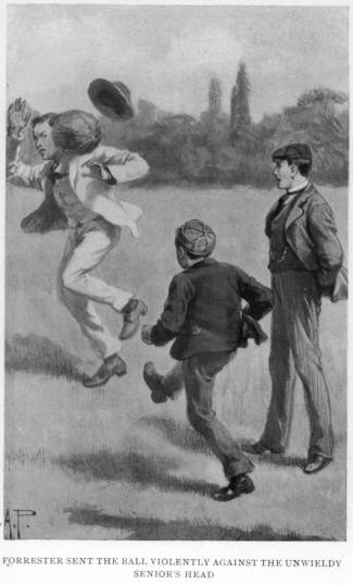 Before, however, Jeffreys could step aside, a neat and, for a wonder, accurate drop-kick from Forrester sent the ball violently against the side of the unwieldy senior’s head, knocking off his hat and nearly precipitating him a second time to the earth.