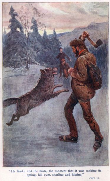 I stood ready to receive the animal, doubtful whether I ought to make the attack; Lily, in the meantime, continuing to cry aloud for help. The wolf at length seemed to get tired of waiting for his expected prey, and giving a fierce howl, he was on the point of springing at me, when a bullet fired by an unseen hand laid him dead at my feet.