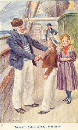 “Good-bye, Walter; good-bye, Miss Alice; look after father, and obey him, and God will bless you. If we are all spared, I hope to see you, Walter, grown into a tall young man; and you, Miss Alice, I suppose I shan’t know you again. Good-bye; Heaven protect you.” Saying this, the old pilot lowered himself into his boat alongside, and pulled away for his cutter, which lay hove-to at a little distance.