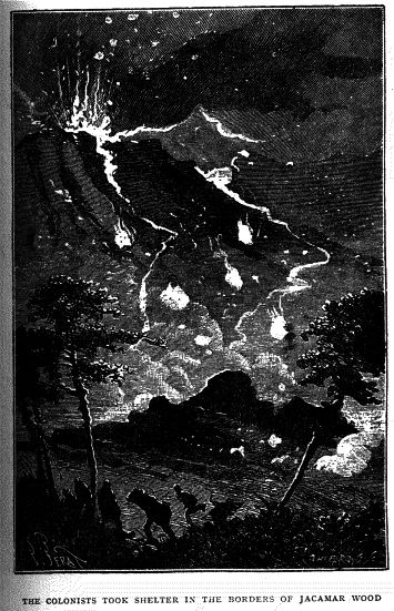 Towards seven in the morning the position was no longer tenable by the colonists, who accordingly took shelter in the borders of Jacamar Wood. Not only did the projectiles begin to rain around them, but the lava, overflowing the bed of Red Creek, threatened to cut off the road to the corral. The nearest rows of trees caught fire, and their sap, suddenly transformed into vapour, caused them to explode with loud reports, whilst others, less moist, remained unhurt in the midst of the inundation.
