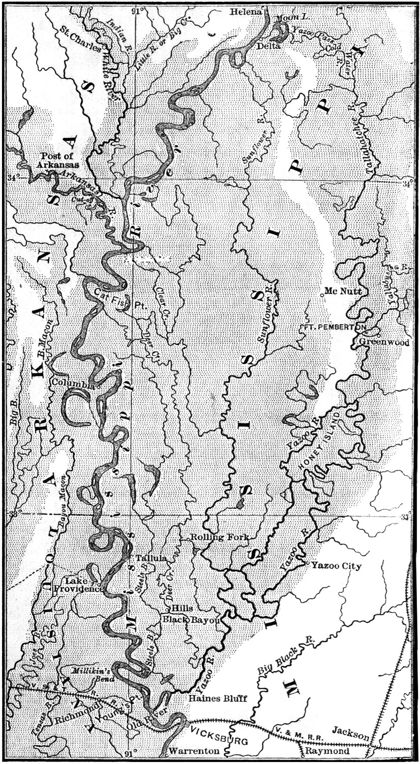 At a few points of the banks high land is encountered. On the right, or western, bank there is but one such, at Helena, in the State of Arkansas, between three and four hundred miles below Cairo. On the left bank such points are more numerous. The first is at Columbus, twenty-one miles down the stream; then follow the bluffs at Hickman, in Kentucky; a low ridge (which also extends to the right bank) below New Madrid, rising from one to fifteen feet above overflow; the four Chickasaw bluffs in Tennessee, on the southernmost of which is the city of Memphis; and finally a rapid succession of similar bluffs extending for two hundred and fifty miles, [11]at short intervals, from Vicksburg, in Mississippi, about six hundred miles below Cairo, to Baton Rouge, in Louisiana. Of these last Vicksburg, Grand Gulf, and Port Hudson became the scenes of important events of the war.