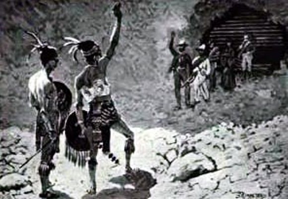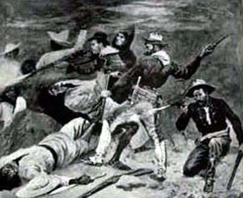 When we ceased firing it was impossible to see anything in the oratory, because of the dense cloud of sulphurous smoke wherewith it was filled; but such shrieks and yells of soul-racking terror as came from beneath that black canopy I hope I may never hear again. I waited a little, until this wild outburst had somewhat quieted, and then—placing my mouth close to one of the openings and speaking in a voice that I tried to make like that of Fray Antonio—I said, in deep and solemn tones, "Behold the vengeance of the strangers' God!"