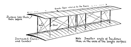 "Look here," exclaimed a number of Struts, "we have got a brilliant idea for improving the Aspect Ratio," and with that they hopped up on to the Spars. "Now," excitedly, "place another Surface on top of us. Now do you see? There is double the Surface, and that being so, the proportion of Weight to Surface area is halved. That's less burden of work for the Surface, and so the Spars need not be so strong and so deep, which results in not so thick a Surface. That means the Chord can be proportionately decreased without adversely affecting the Camber. With the Chord decreased, the Span becomes relatively greater, and so produces a splendid Aspect Ratio, and an excellent proportion of Lift to Drift."