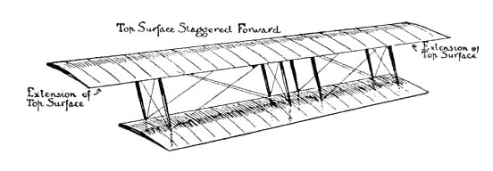 At this moment a hiccough was heard, and a rather fast and rakish-looking chap, named Stagger, spoke up. "How d'ye do, miss," he said politely to Efficiency, with a side glance out of his wicked old eye. "I'm a bit of a knut, and without the slightest trouble I can easily minimize the disadvantage that old reprobate Drift has been frightening you with. I just stagger the top Surface a bit forward, and no longer is that suction effect dead under it. At the same time I'm sure the top Surface will kindly extend its Span for such distance as its Spars will support it without the aid of Struts. Such extension will be quite useful, as there will be no Surface at all underneath it to interfere with the Reaction above." And the Stagger leaned forward and picked up the Chalk, and this is the picture he drew: